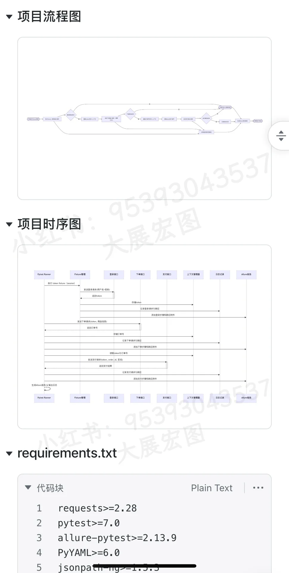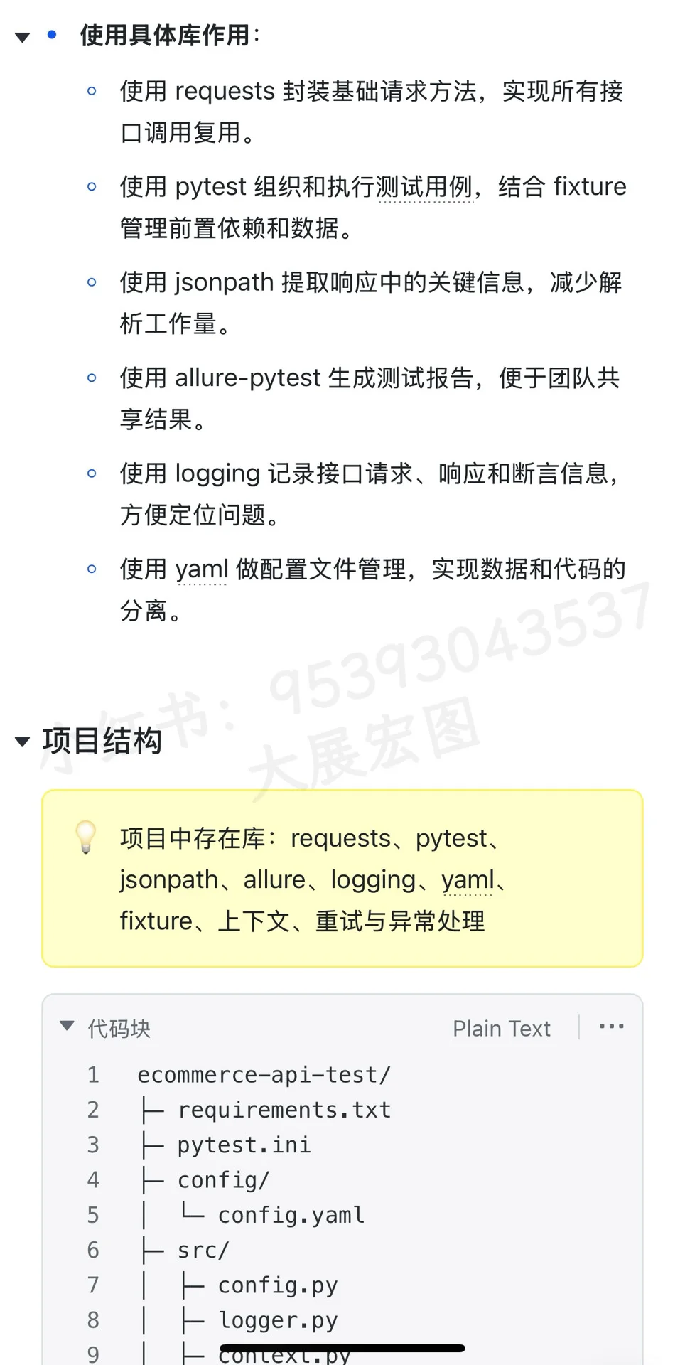 第二类就是测试框架相关的库,我主要用 pytest,它非常轻量,也容易集成。我一般会结合 fixture 来实现前置依赖,比如登录拿 token,然后再执行后续的用例…