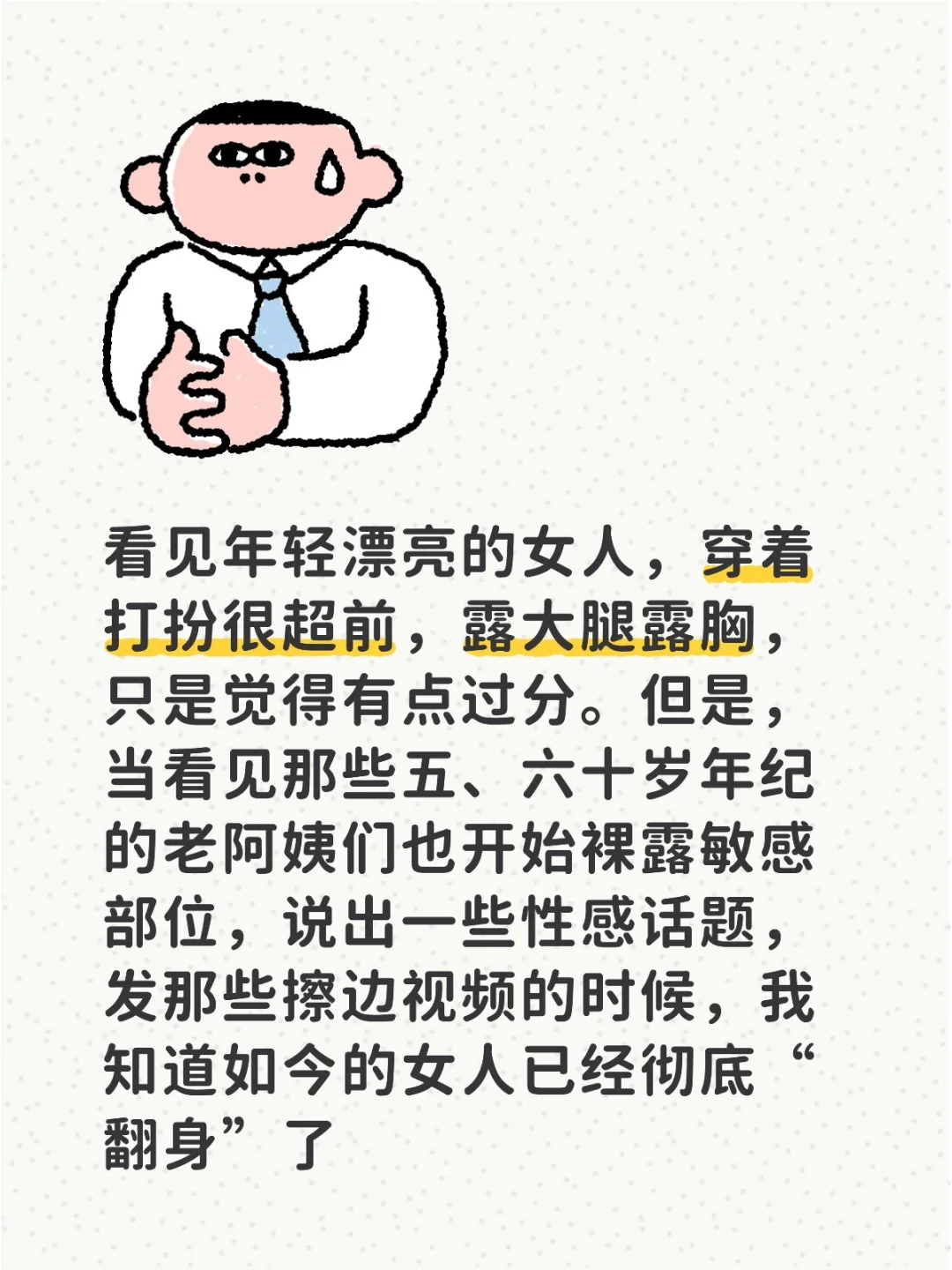 看见年轻漂亮的女人,穿着打扮很超前,露大腿露胸,只是觉得有点过分。但是,当看见那些五、六十岁年纪的老阿姨们也开始裸露敏感部位,说出一些性感话题,发那些擦边视频的时候,我知道如今的女人已经彻底“翻身”了