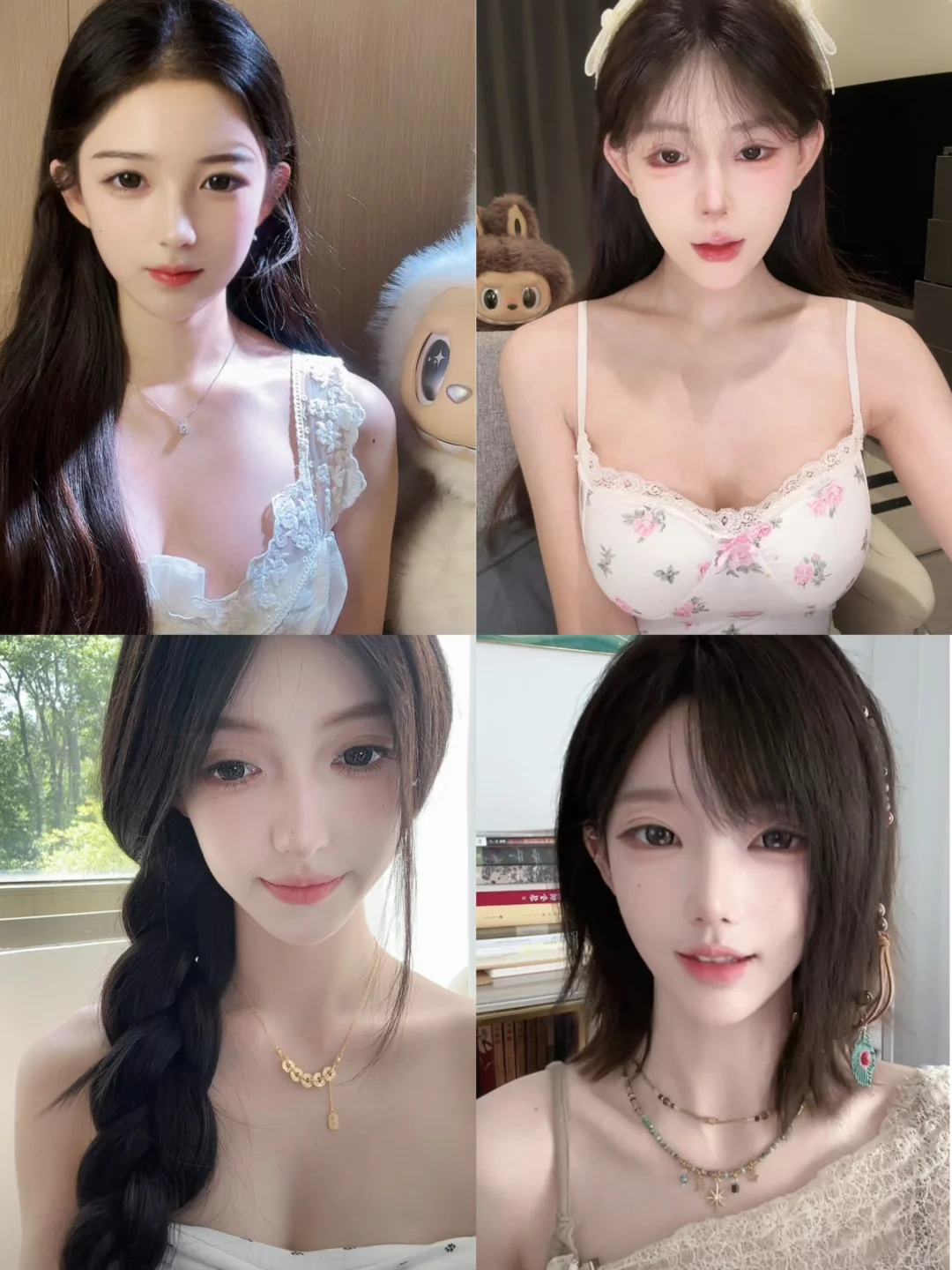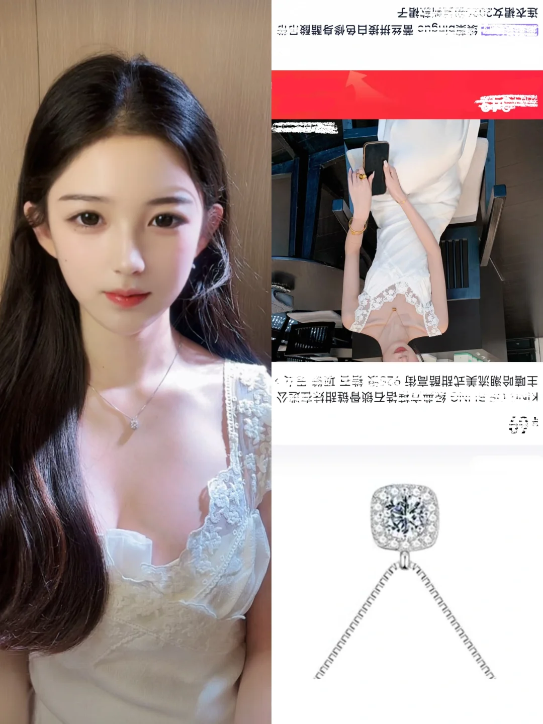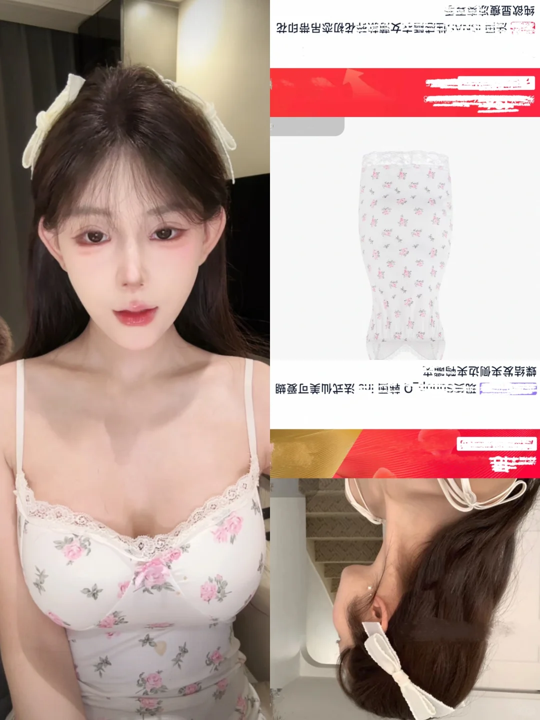 白色蕾丝吊带,自带清透氛围感蕾丝的精致纹理,在镜头前会弱化廉价感反而凸显细腻质感,低领设计露出锁骨转移视觉焦点让脸部更突出