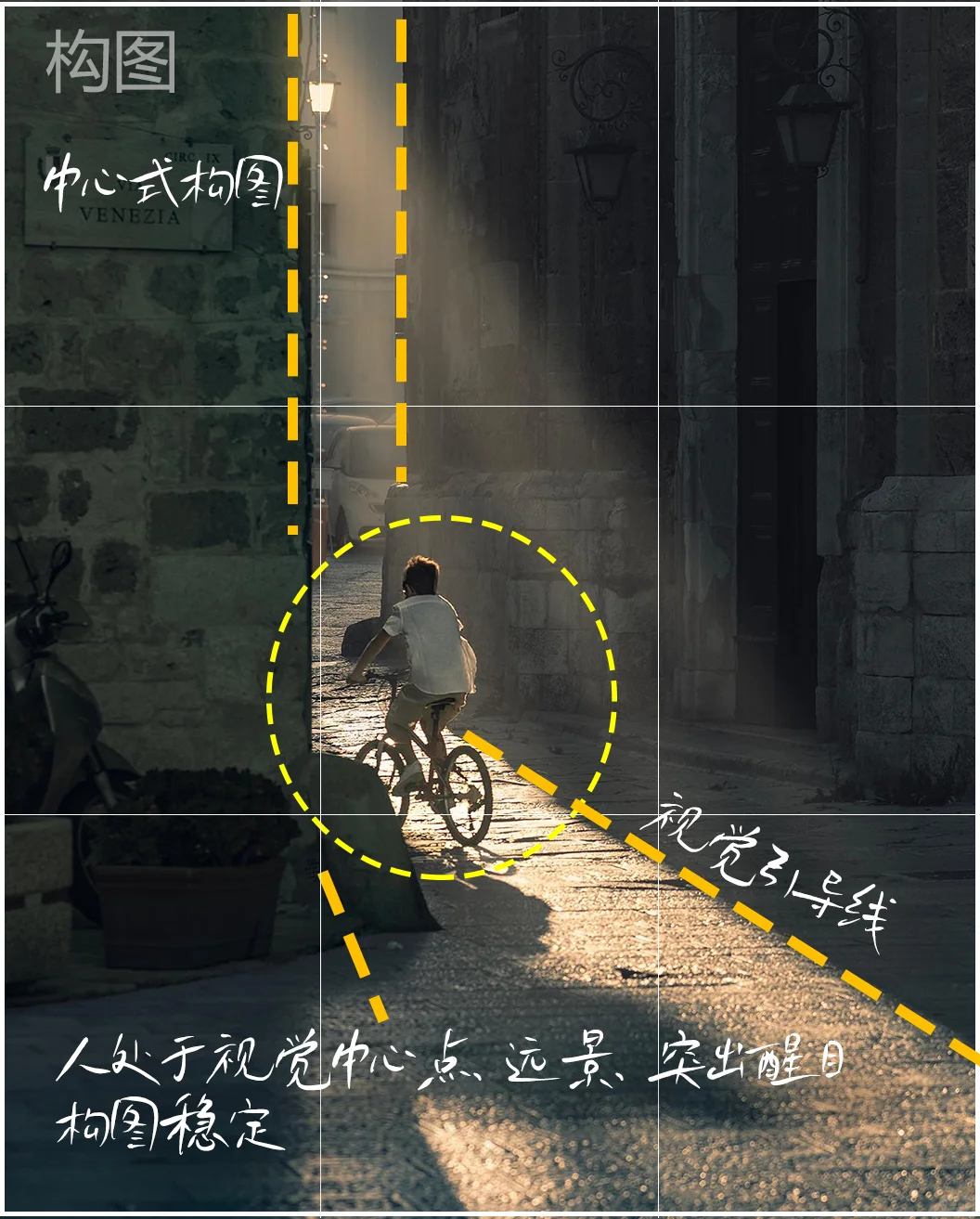 构图:中心式构图,光线和建筑引导视觉,人物处于视觉中心点,远景,构图稳定。
