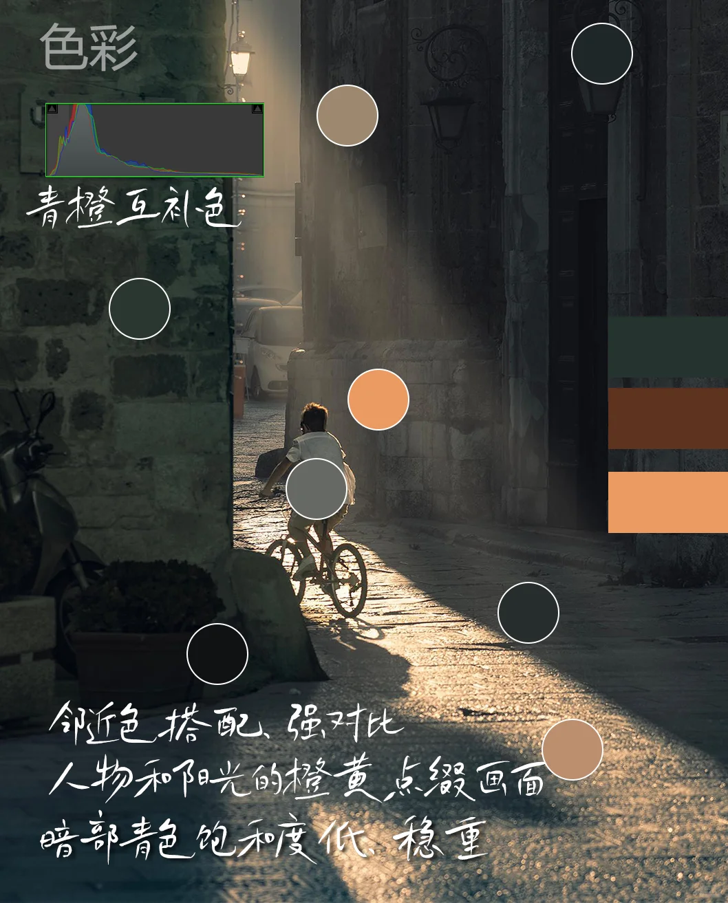色彩:青橙互补色,邻近色搭配,冷暖对比;暗部区域为冷色青绿色,饱和度低,稳重。人物面部是暖橙色,光线呈暖色。