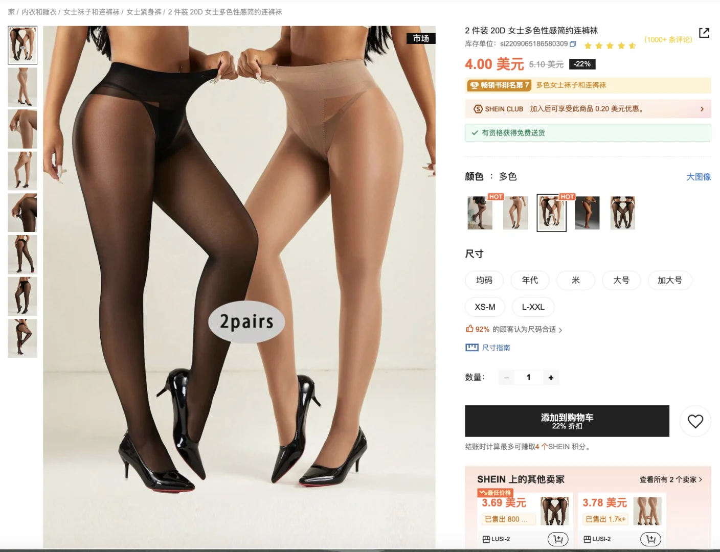 连裤袜是女性重要的消耗品之一,特别是国外,感觉对黑丝的需求比国内大很多。连裤袜冬季夏季有不同的款式,在Shein上需求还挺大的。连裤袜有不同的规格,有xxD/或者xx克两种区分方法,跨境卖家可以多多留意。