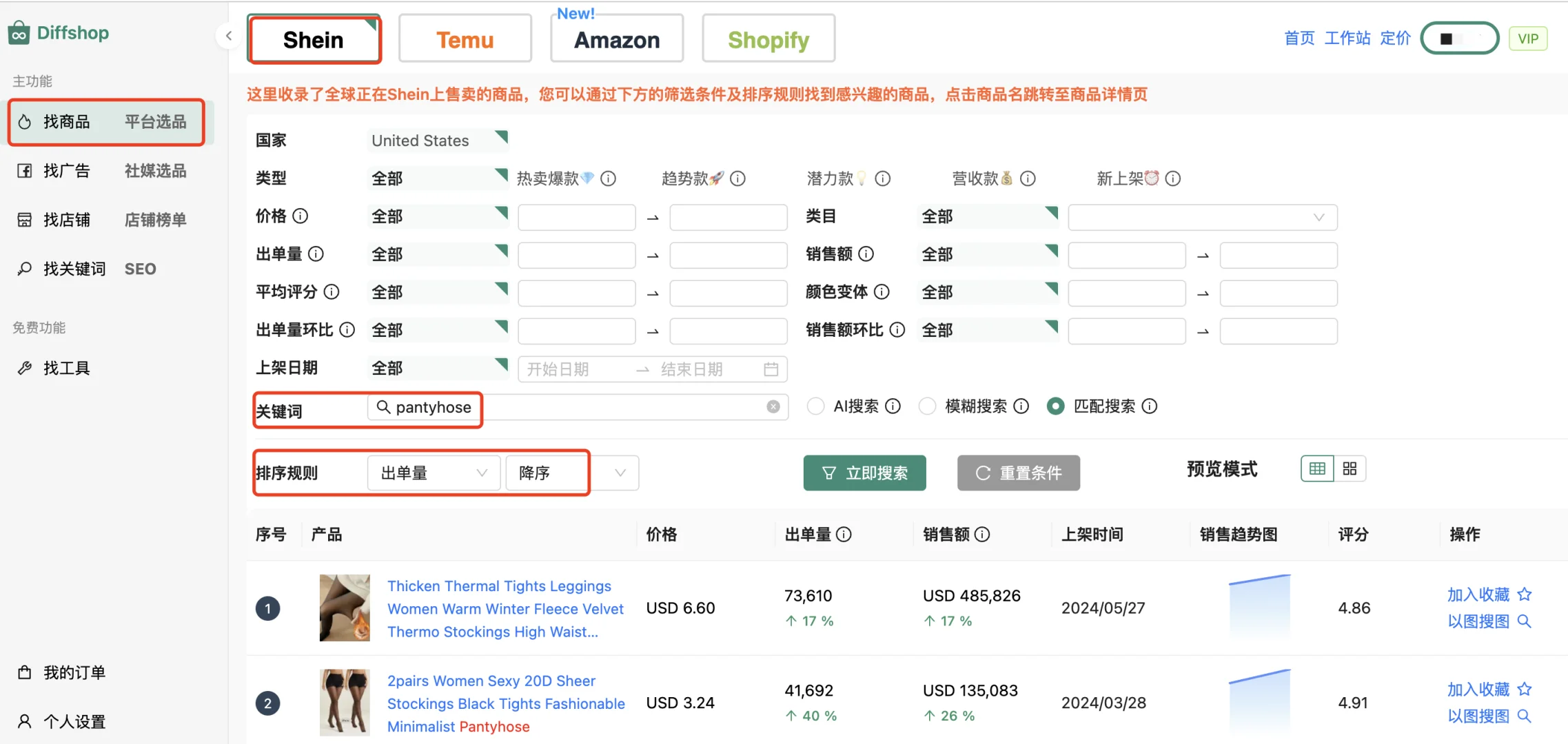 🔍搜索方法:“找商品”功能,选择Shein数据库,关键词输入“pantyhose”(一定要输入英文!),选择匹配搜索,排序规则选按“出单量”降序排序,看看Temu上卖得最好的连裤袜,月销量破万的都有十几款,足以见需求还是很大的。连裤袜款式都大差不差,大家可以自己参考下~