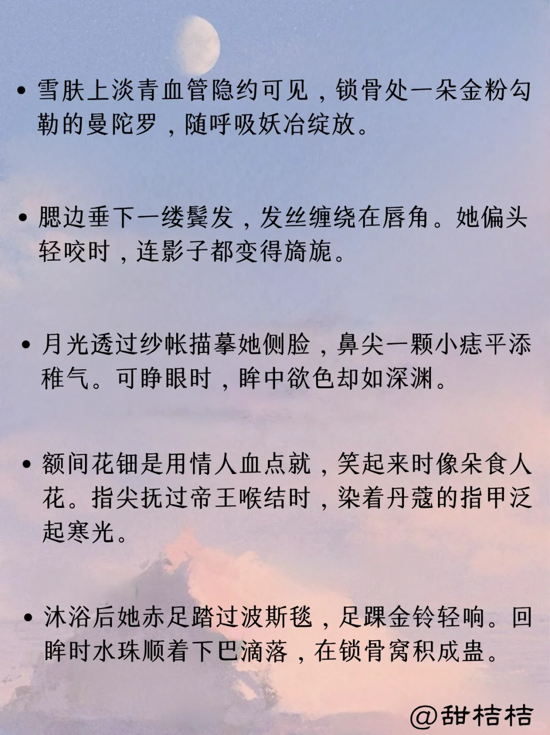 沐浴后仅披一件薄如蝉翼的素纱,水珠顺着锁骨滑落。发间一支金步摇,坠着的珍珠恰巧垂在唇畔,似泪非泪。
