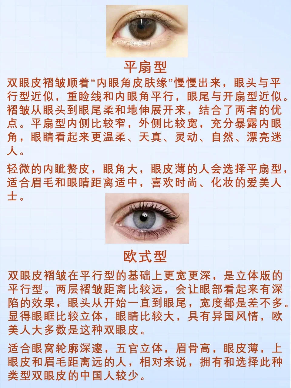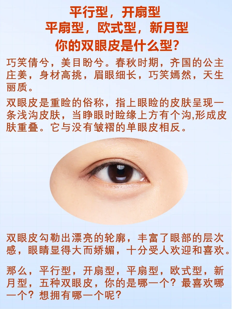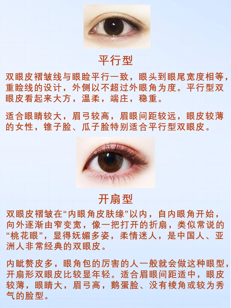 #双眼皮 #双眼皮类型 #双眼皮形态 #平行型双眼皮 #开扇型双眼皮 #平扇型双眼皮 #欧式型双眼皮 #新月型双眼皮