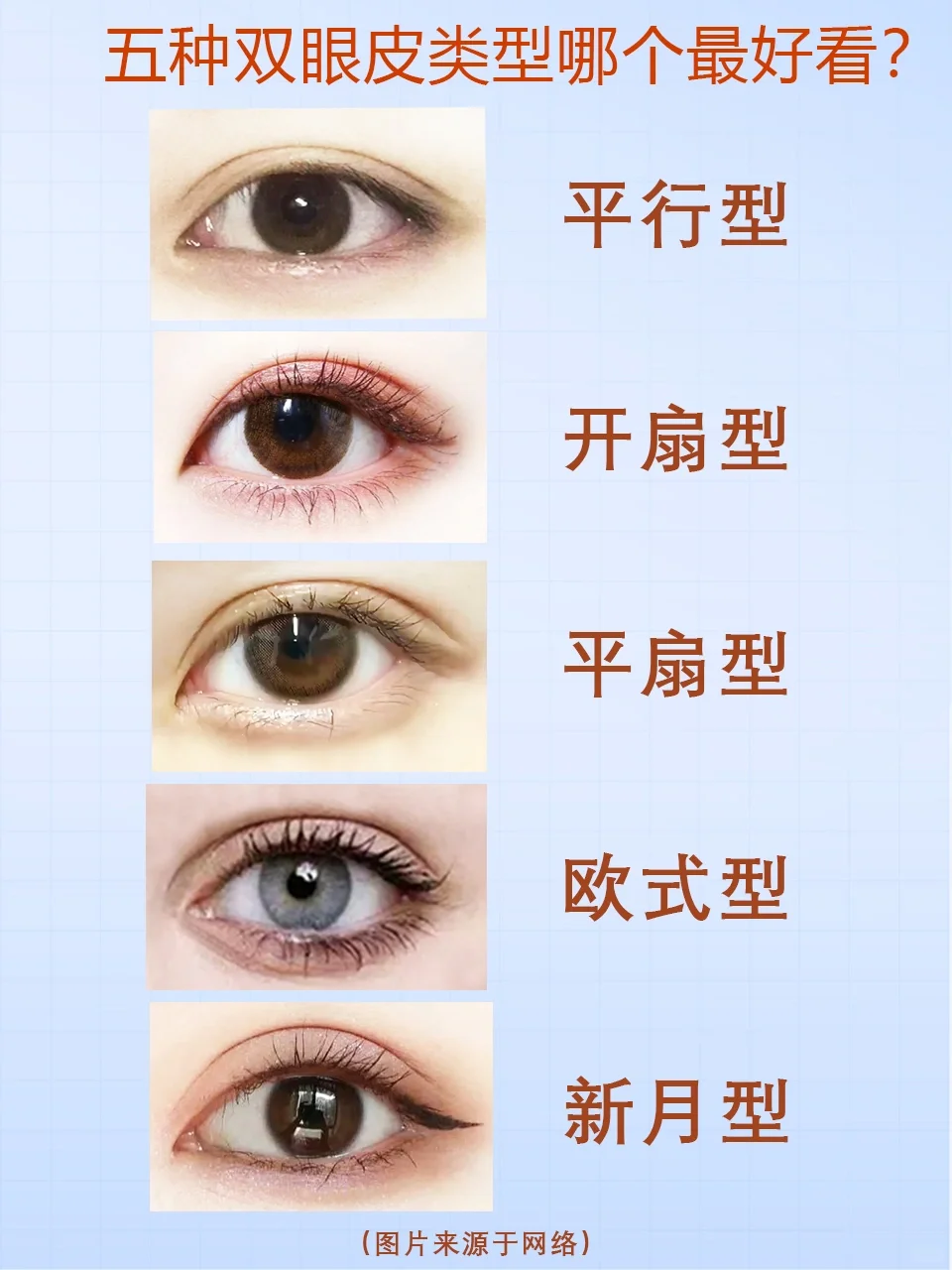 🚩那么,平行型,开扇型,平扇型,欧式型,新月型,五种双眼皮,你的是哪一个?最喜欢哪一个?想拥有哪一个呢?🔽