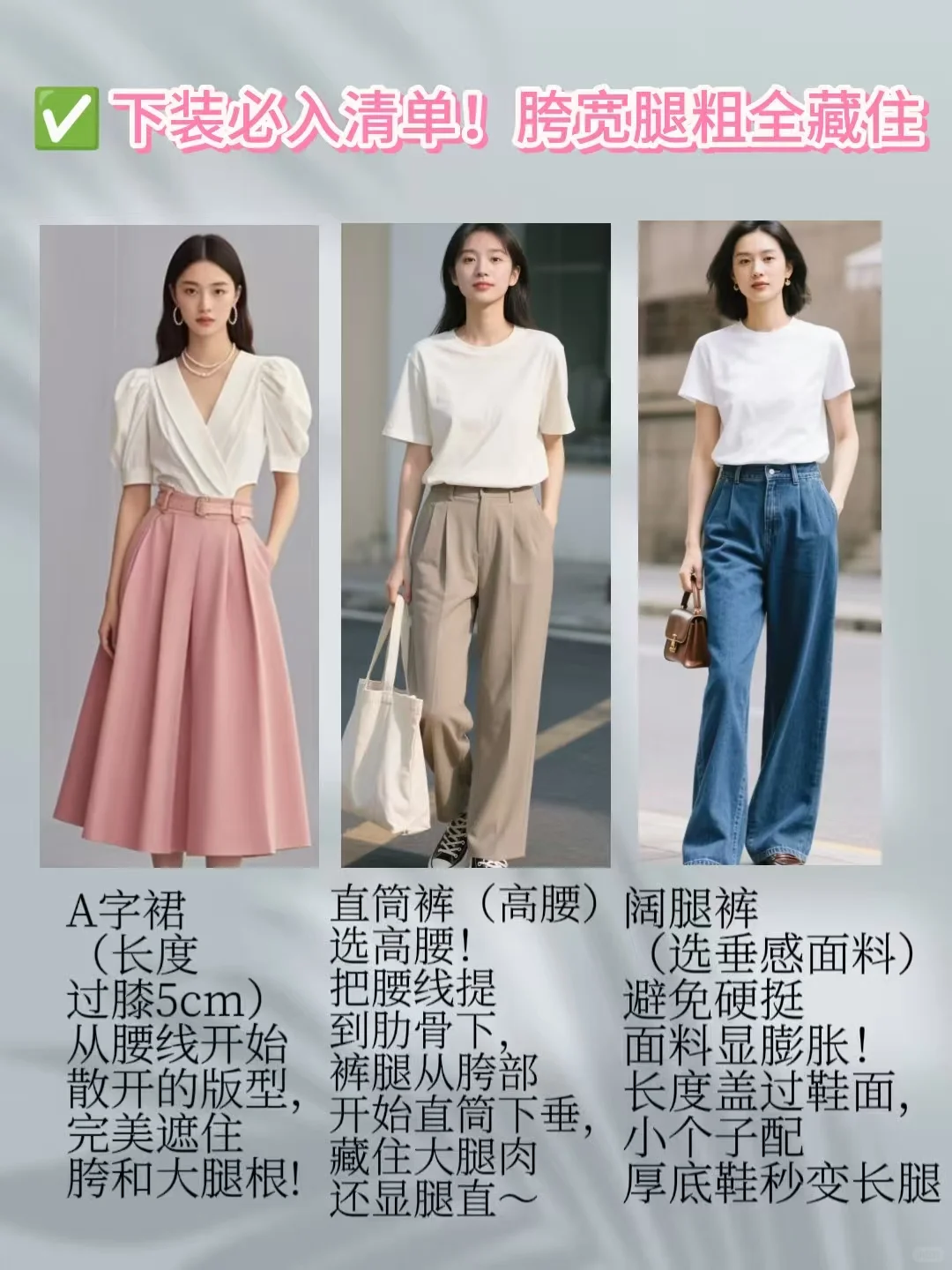 ❌ 缺点要藏住:胯宽、臀大、大腿粗别硬刚!用版型“模糊线条”,别让下半身太紧绷