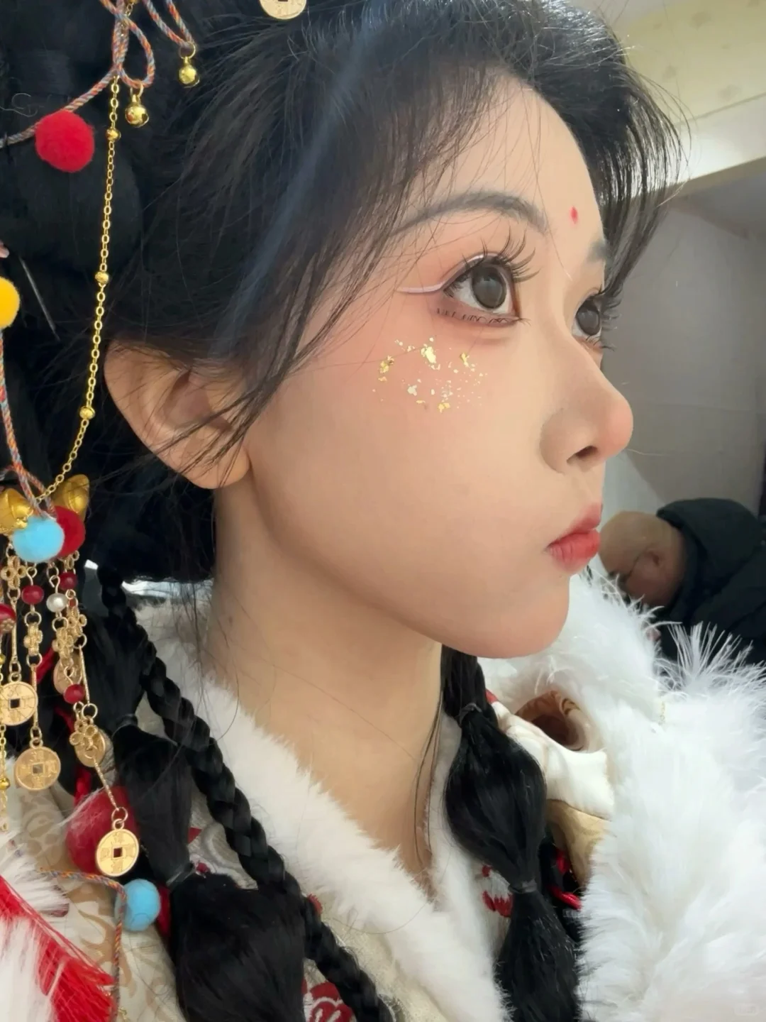 💛妆容:比较粗糙 没有夹睫毛就粘了假睫毛导致睫毛分层严重 鼻影是直挺挺的棍状鼻影 下至画的有点儿夸张