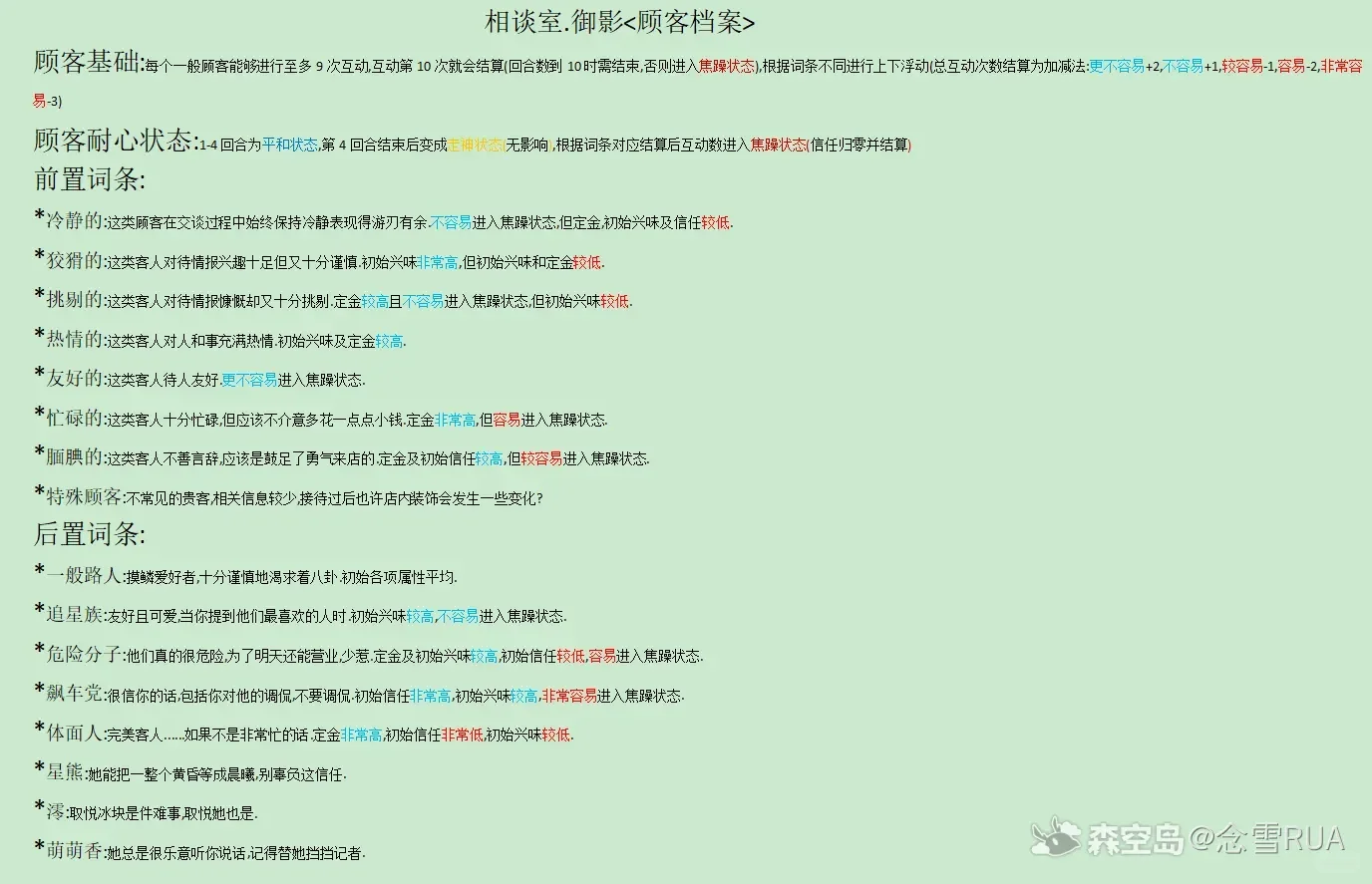 首先关于客人,客人种类和buff、谈话的最佳时机有大佬整理过。而且这些名词只要玩过就会解锁,这里不再赘言。引用了森空岛大佬念雪RUA和另一位大佬整理的结果