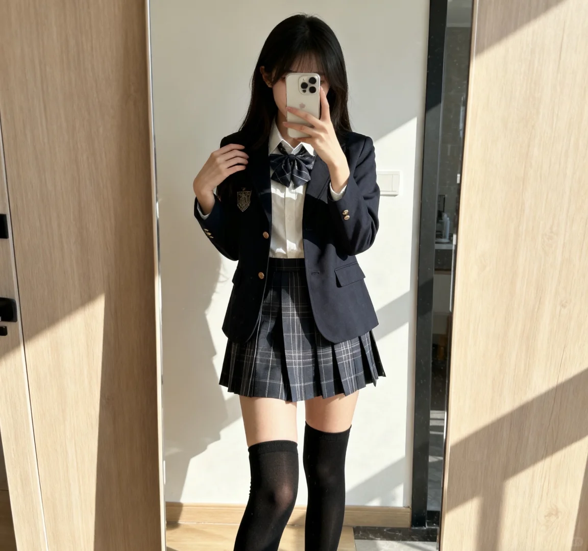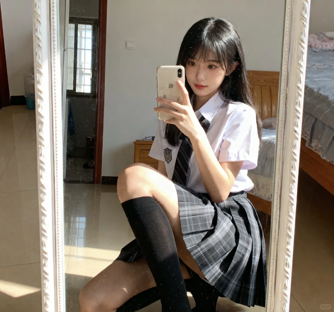 第二张尝试了半身近景,重点聚焦在「细节感」上。把袖口挽到小臂,露出纤细的手腕,另一只手轻轻搭在镜子边缘,黑丝的纹路和JK制服的格纹形成反差,搭配微微歪头的表情,甜酷感一下就出来了,原图直出都不用怎么修!