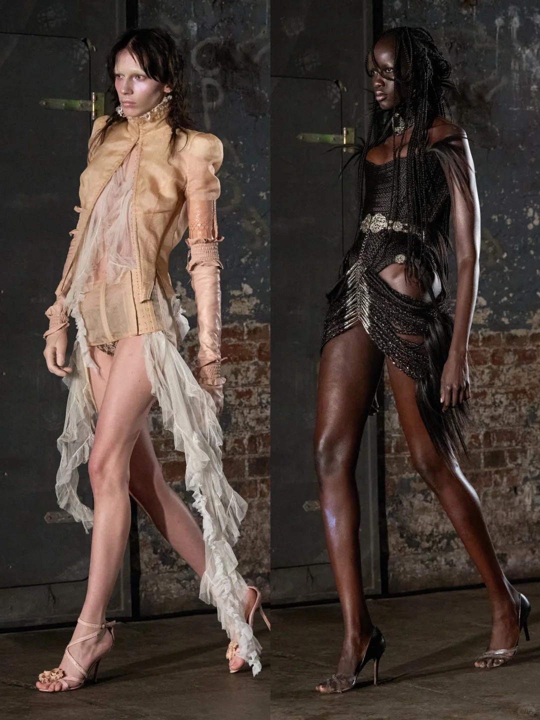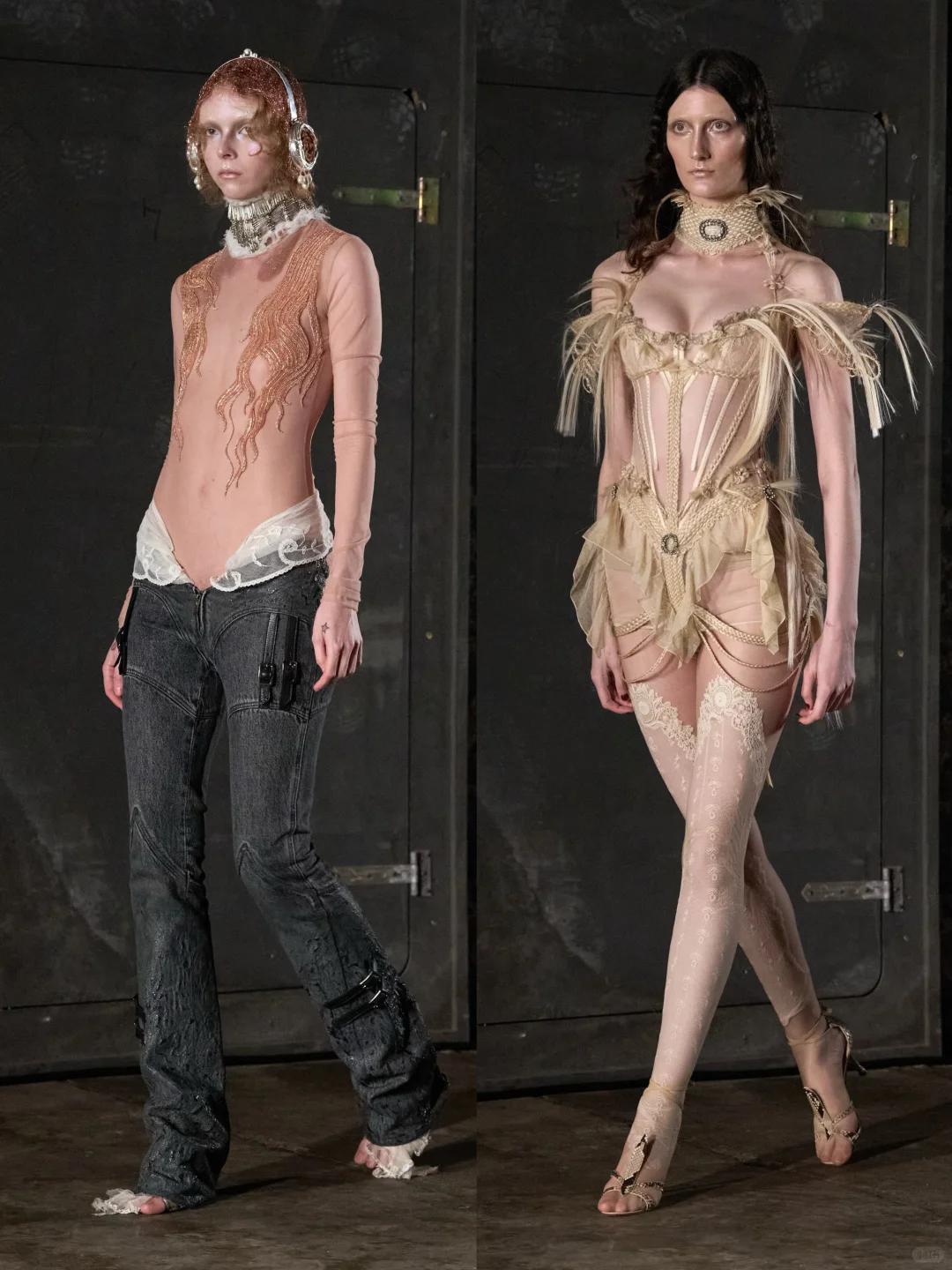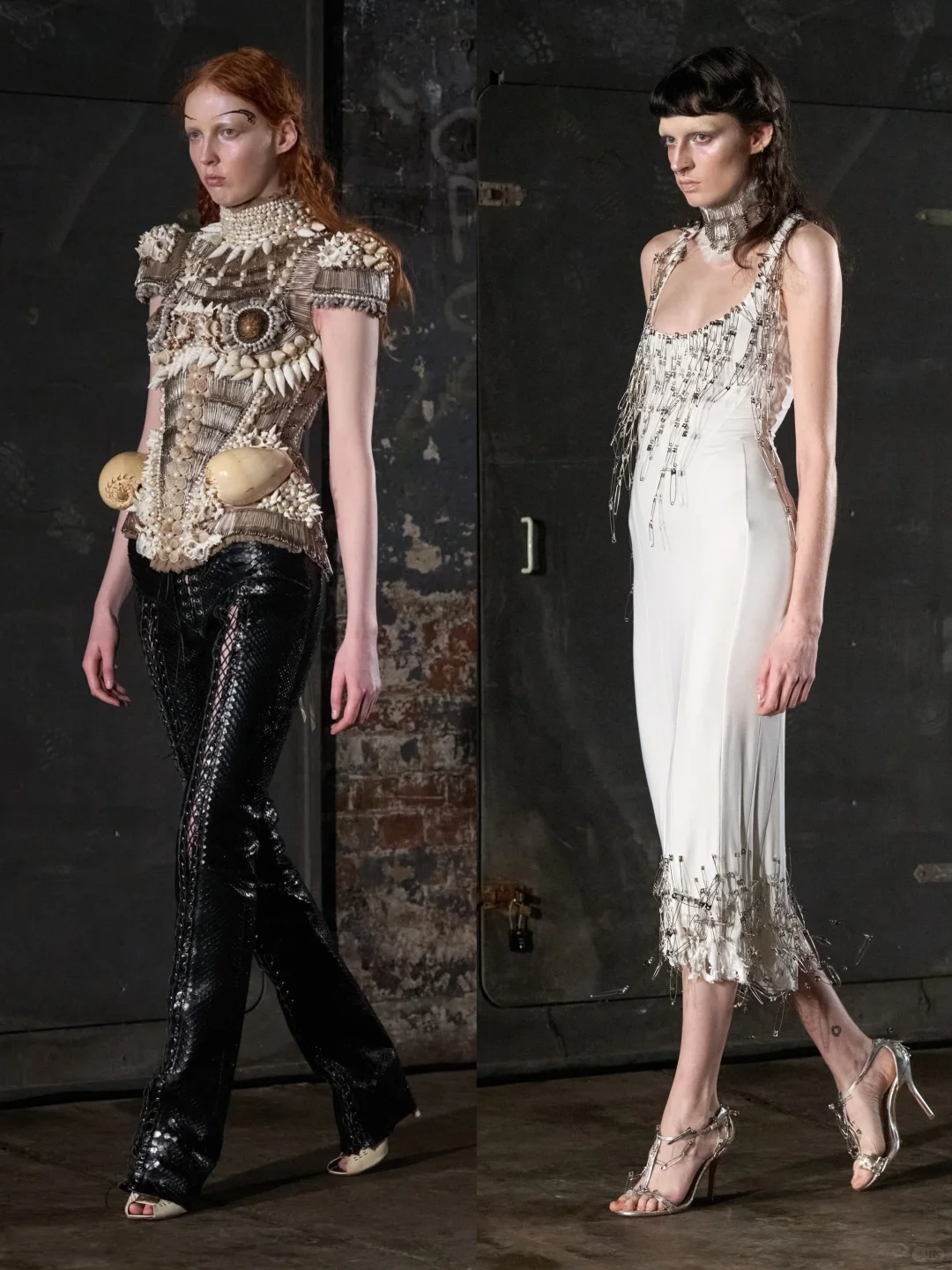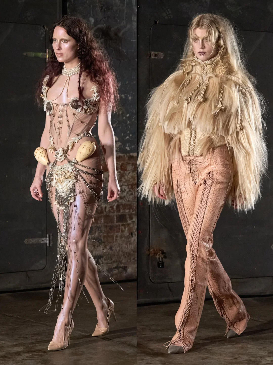 设计师用缠绕的毛发意向模拟再现波提切利笔下的美神维纳斯,而那些将胸衣打造成为女性铠甲的解构设计更是将T台转化为探讨身体自主权与社会暴力的讲坛。在这个被算法与快时尚统治的时代,Dilara Findikoglu的时装哲学犹如一剂清醒剂:真正的时尚不该是逃避现实的绮梦,而应是刺破时代脓疮的手术刀