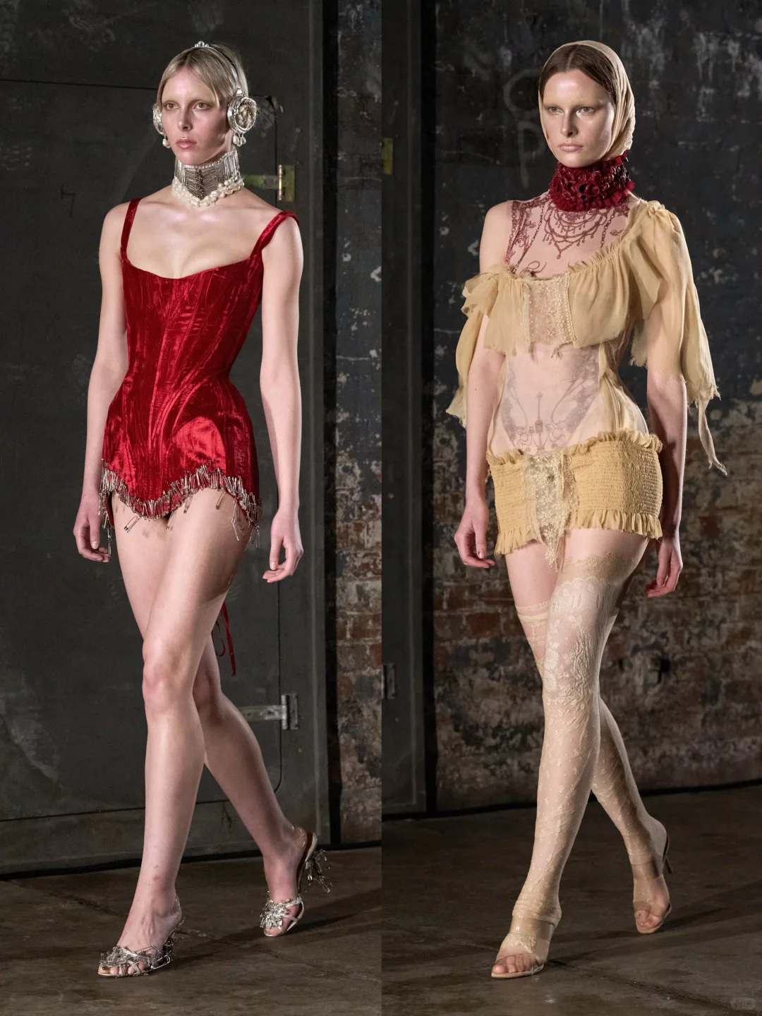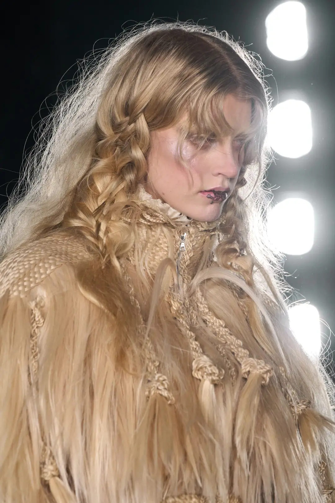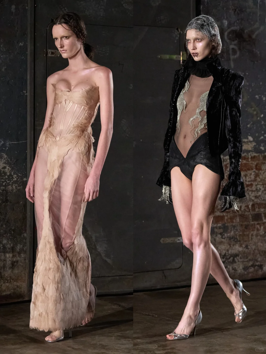 设计师用缠绕的毛发意向模拟再现波提切利笔下的美神维纳斯,而那些将胸衣打造成为女性铠甲的解构设计更是将T台转化为探讨身体自主权与社会暴力的讲坛。在这个被算法与快时尚统治的时代,Dilara Findikoglu的时装哲学犹如一剂清醒剂:真正的时尚不该是逃避现实的绮梦,而应是刺破时代脓疮的手术刀