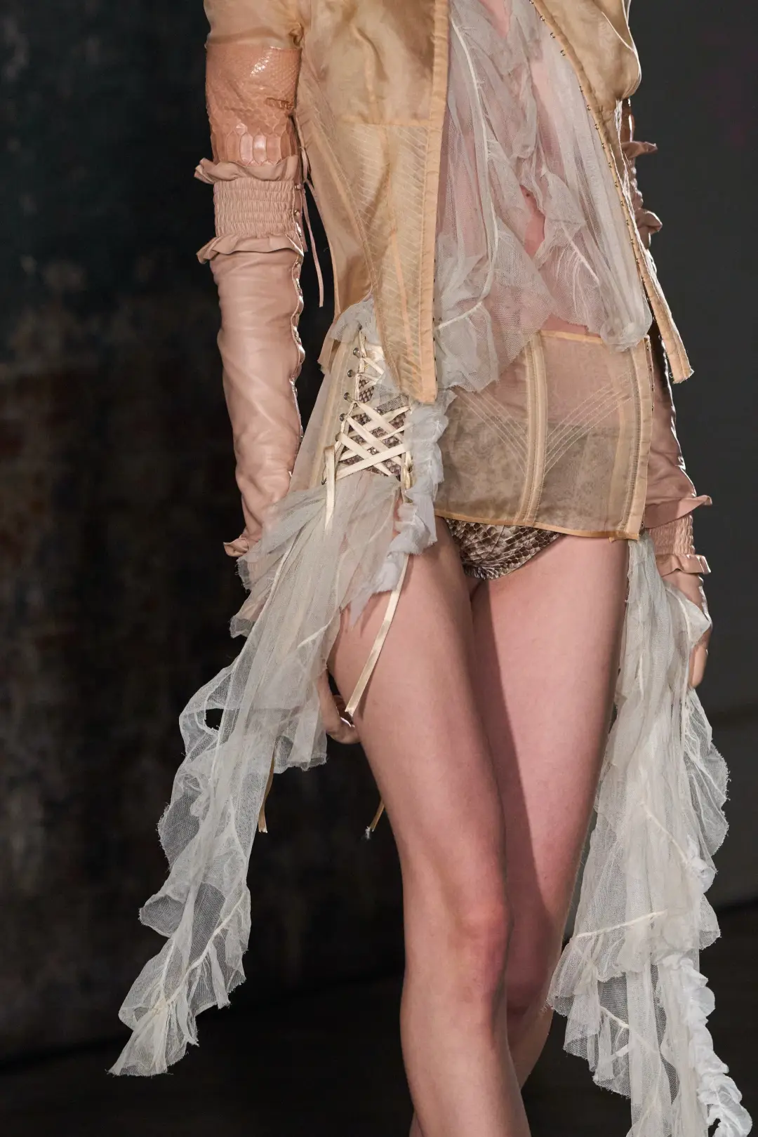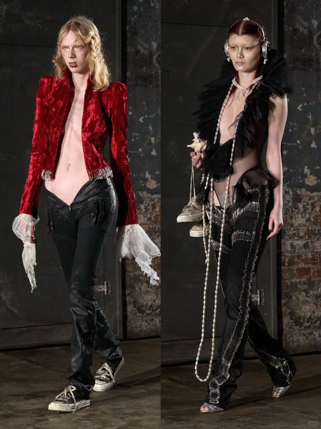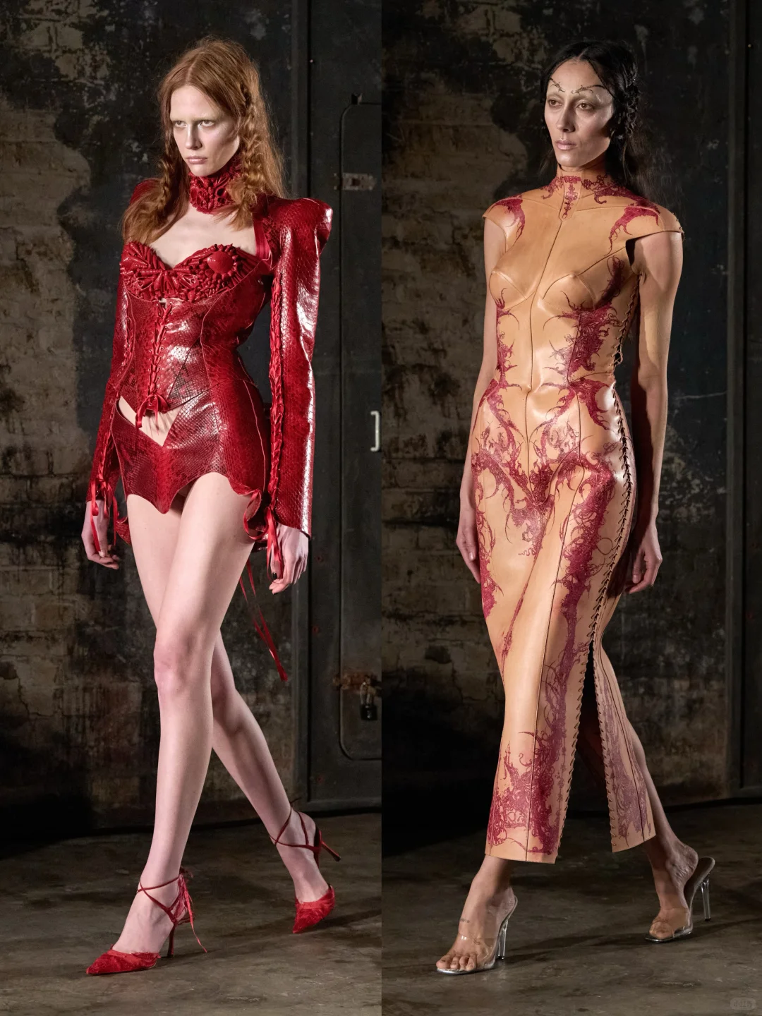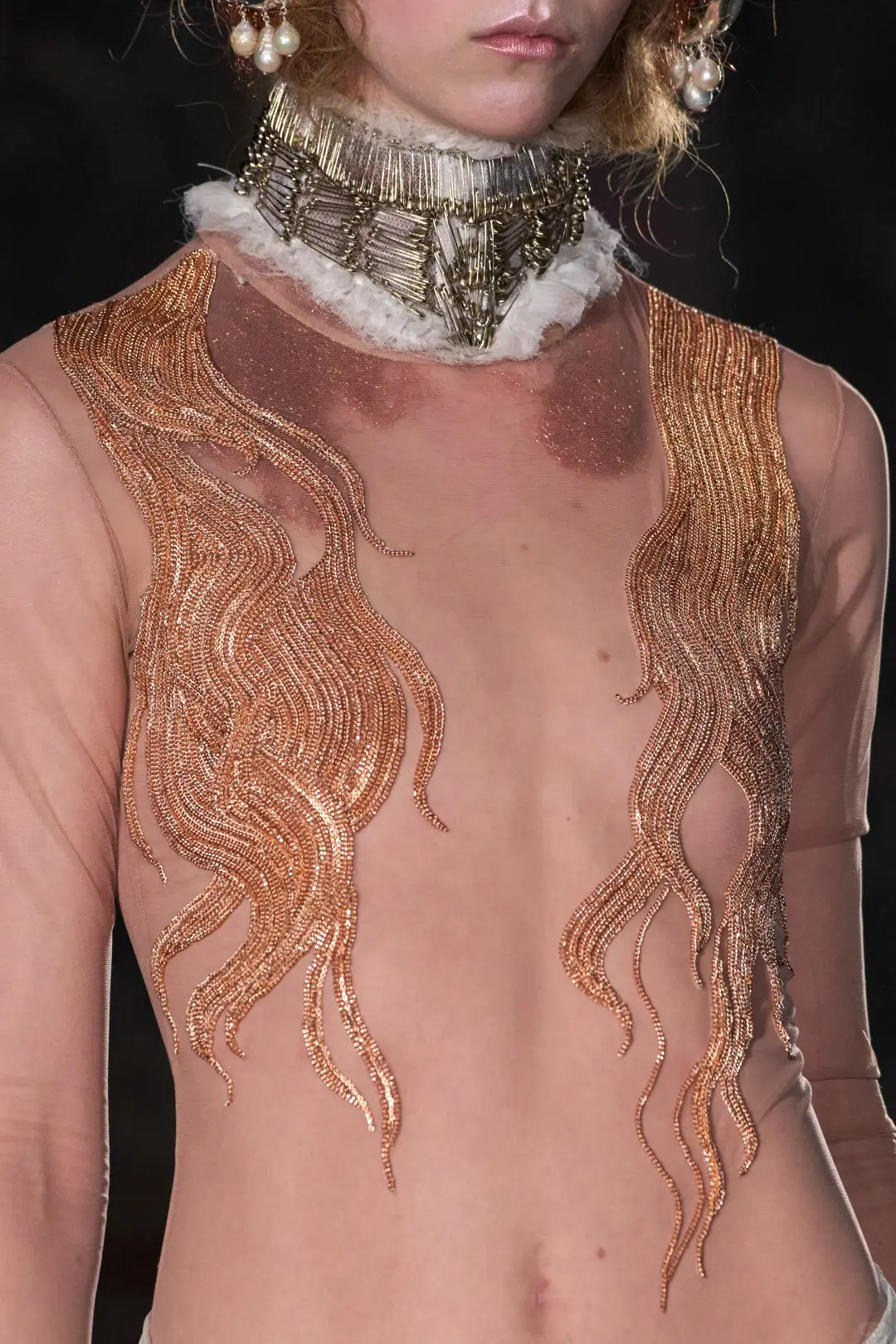 设计师用缠绕的毛发意向模拟再现波提切利笔下的美神维纳斯,而那些将胸衣打造成为女性铠甲的解构设计更是将T台转化为探讨身体自主权与社会暴力的讲坛。在这个被算法与快时尚统治的时代,Dilara Findikoglu的时装哲学犹如一剂清醒剂:真正的时尚不该是逃避现实的绮梦,而应是刺破时代脓疮的手术刀
