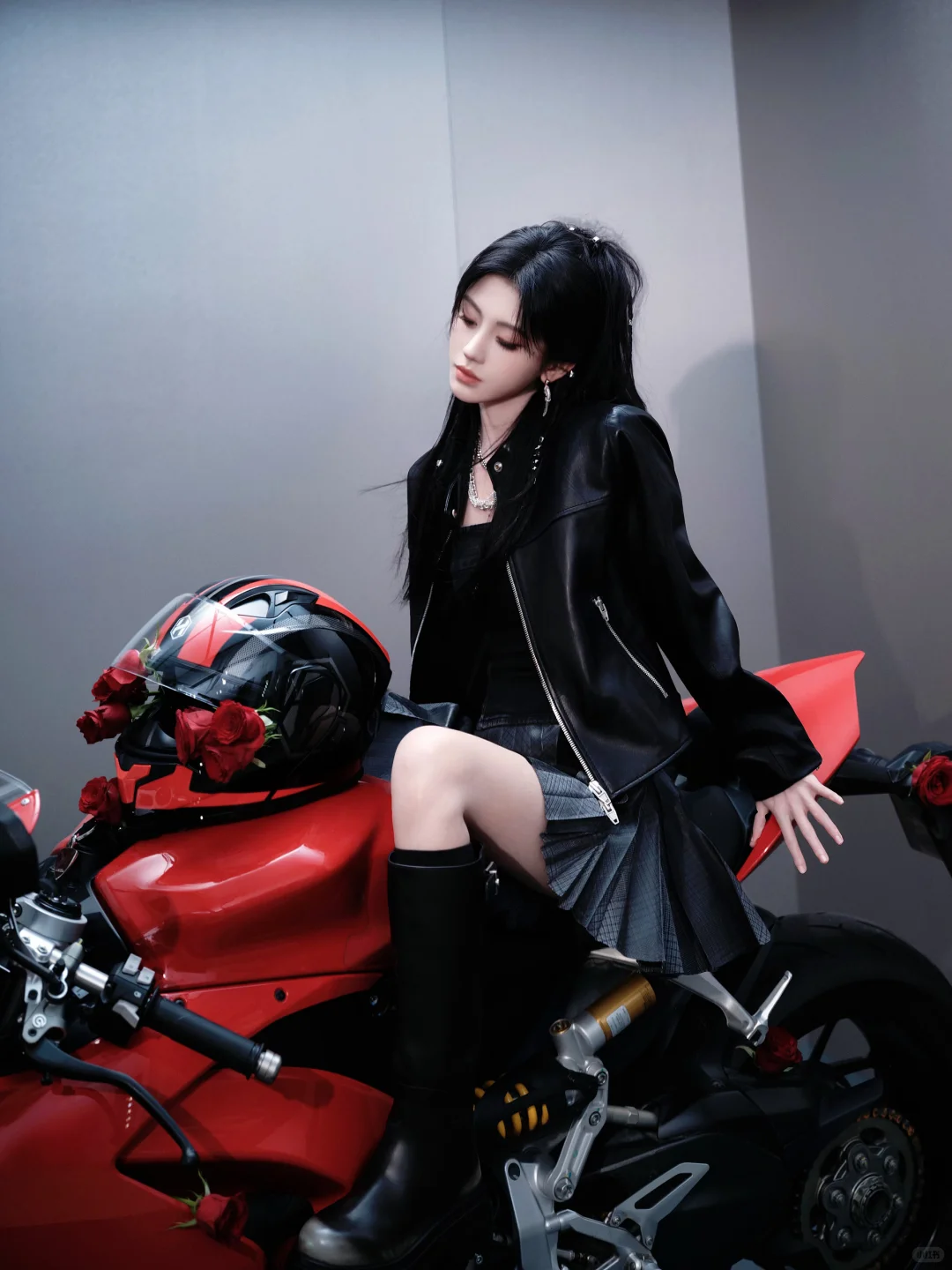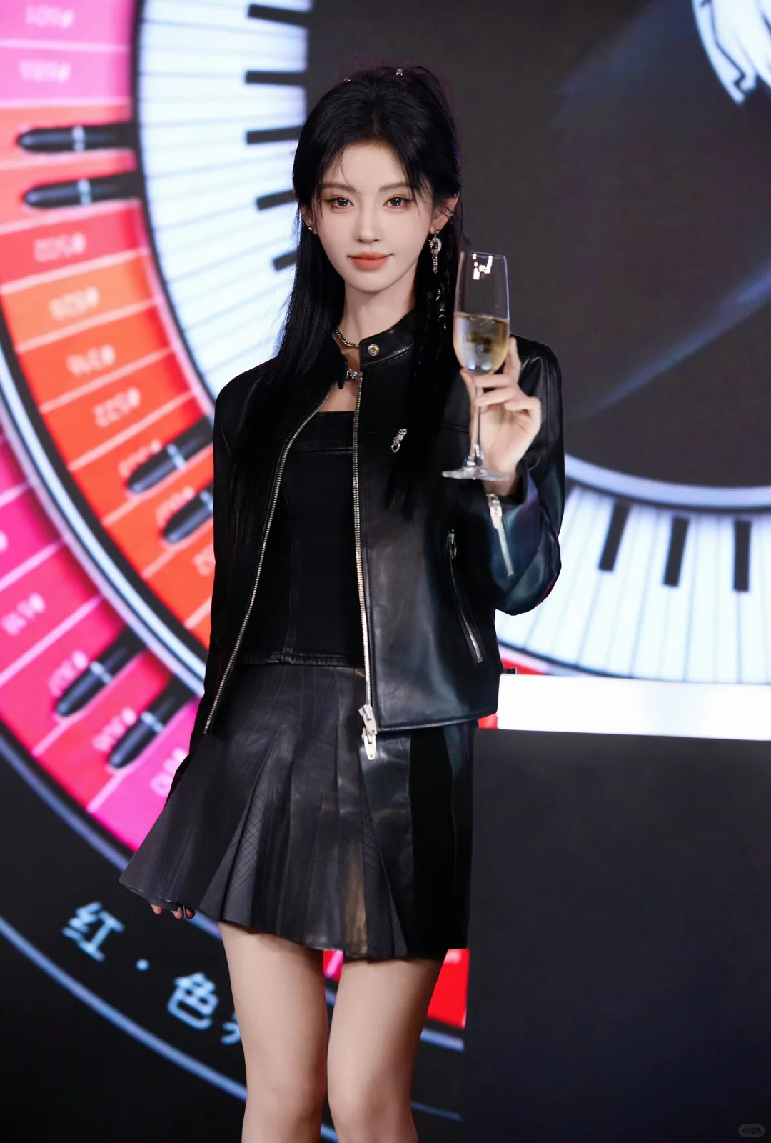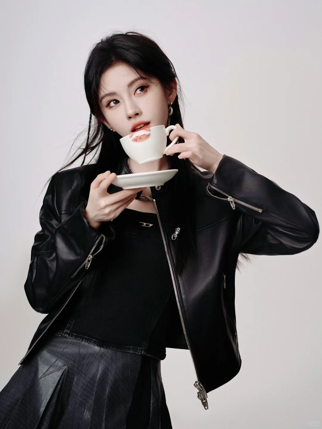 这次上身的Diesel皮夹克质感上乘,挺括的版型勾勒出她的身形线条,彰显出不羁的个性。皮革的光泽与金属拉链细节,为整体造型注入了强烈的机车风元素,传递出自由与叛逆的时尚态度。内搭简约却不失精致,与皮夹克形成层次感。下身的利落短裙,巧妙地展现出她修长的双腿,同时增添了几分俏皮与活力,中和了皮夹克的硬朗,使整体造型刚柔并济。