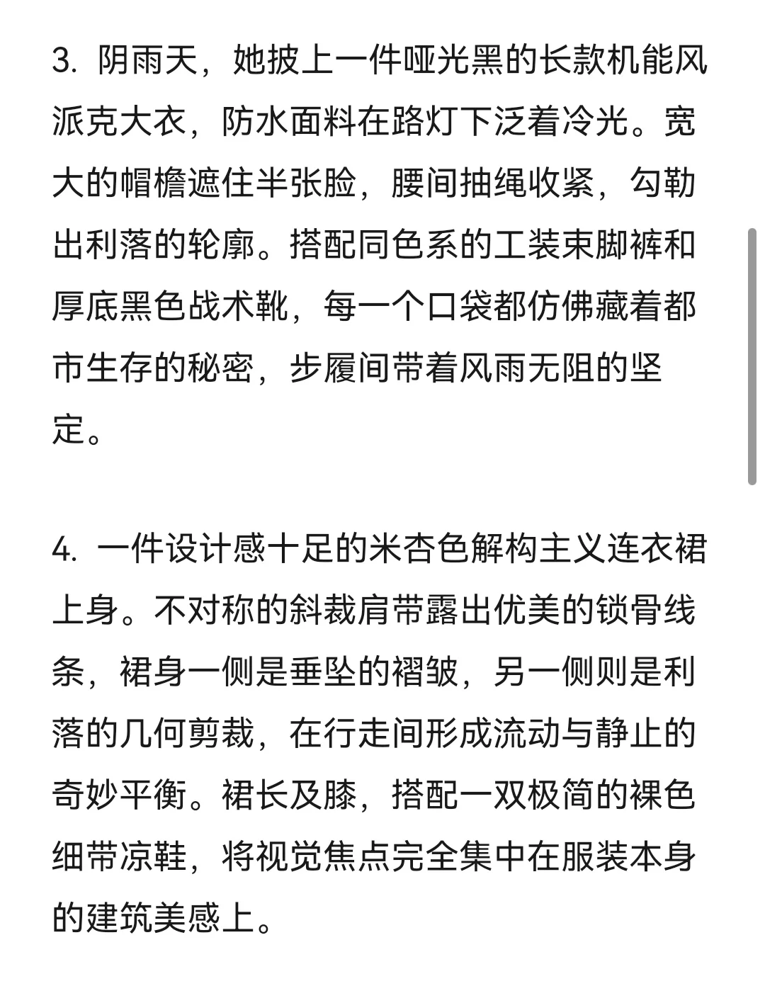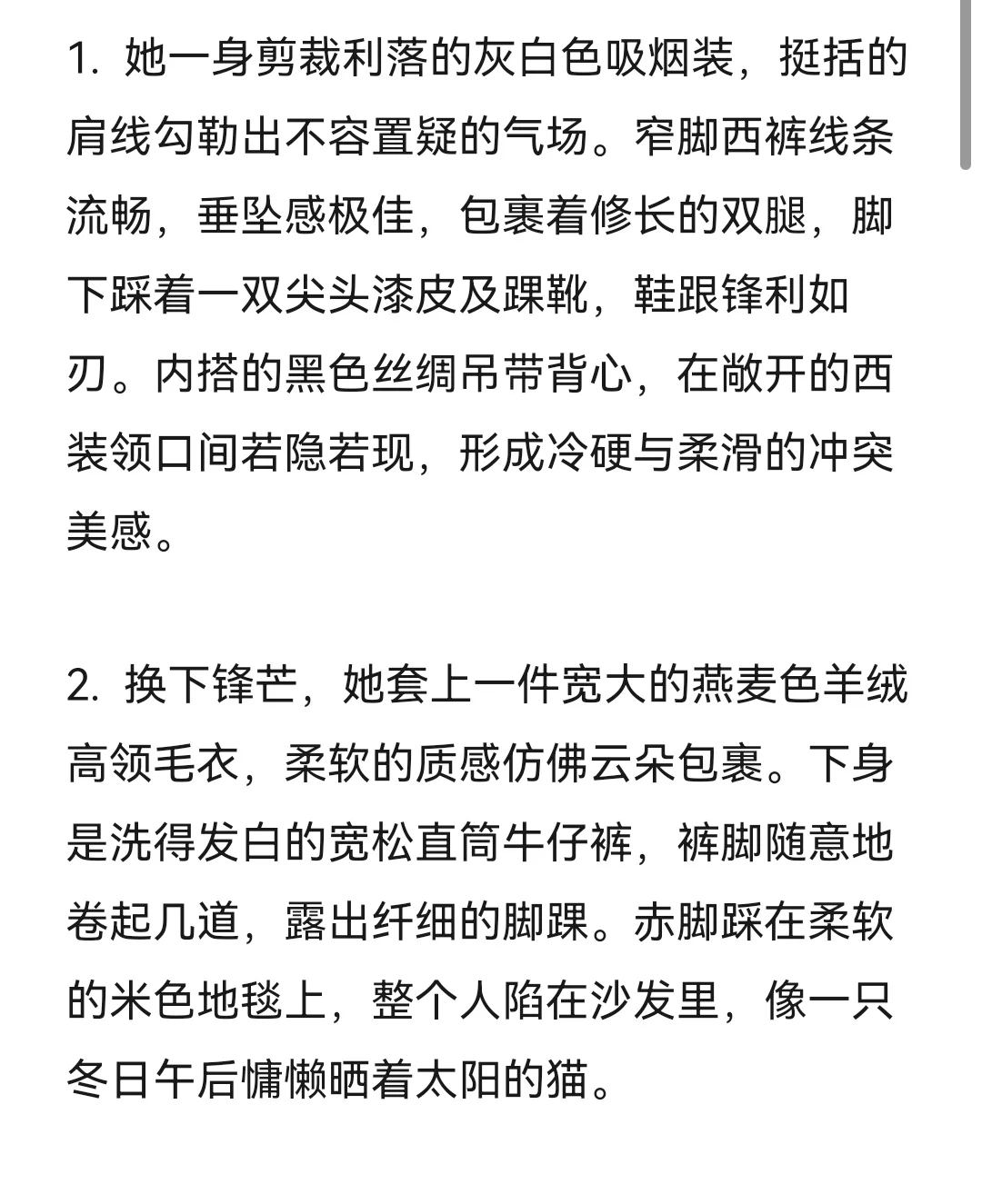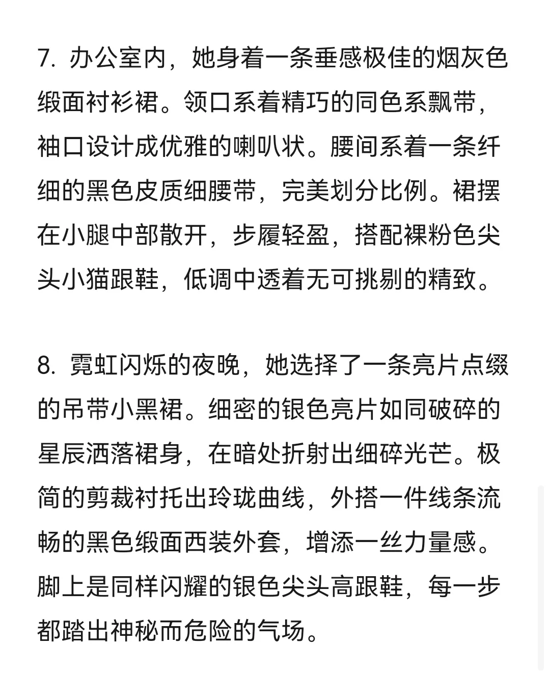 7. 办公室内,她身着一条垂感极佳的烟灰色缎面衬衫裙。领口系着精巧的同色系飘带,袖口设计成优雅的喇叭状。腰间系着一条纤细的黑色皮质细腰带,完美划分比例。裙摆在小腿中部散开,步履轻盈,搭配裸粉色尖头小猫跟鞋,低调中透着无可挑剔的精致。#小说写作干货 #写网文 #网文作者#小说写作素材积累 #我会被文字打动 #小说写作 #写小说 #写作干货 #素材分享 #网文小说 #网文 #写作 #网文小说写作素材#被文字打动