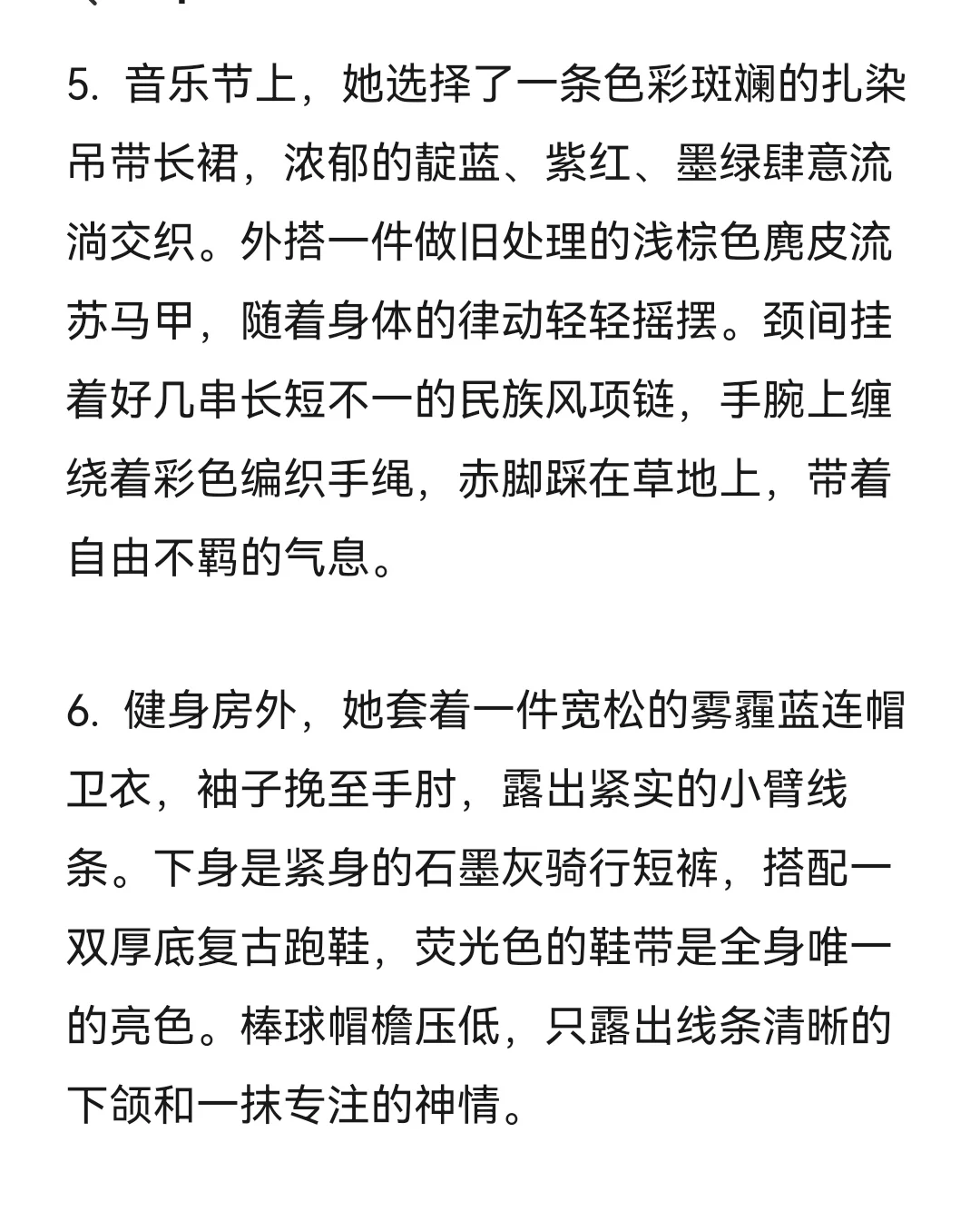 5. 音乐节上,她选择了一条色彩斑斓的扎染吊带长裙,浓郁的靛蓝、紫红、墨绿肆意流淌交织。外搭一件做旧处理的浅棕色麂皮流苏马甲,随着身体的律动轻轻摇摆。颈间挂着好几串长短不一的民族风项链,手腕上缠绕着彩色编织手绳,赤脚踩在草地上,带着自由不羁的气息。