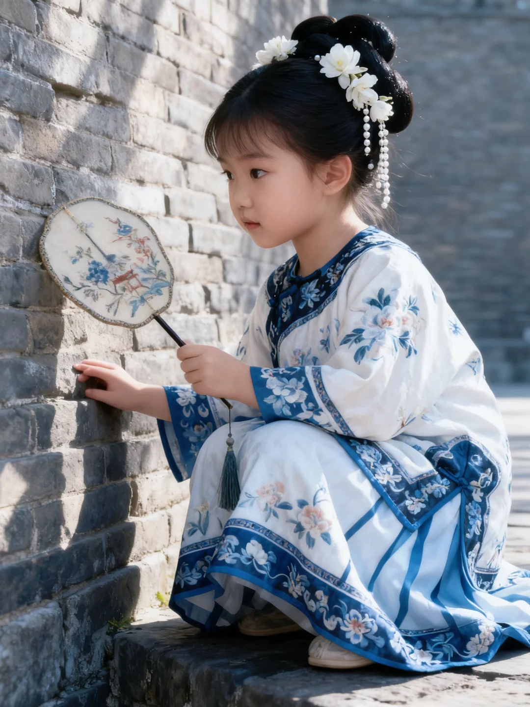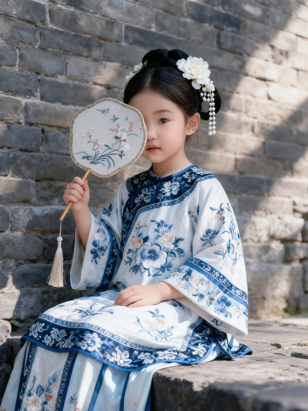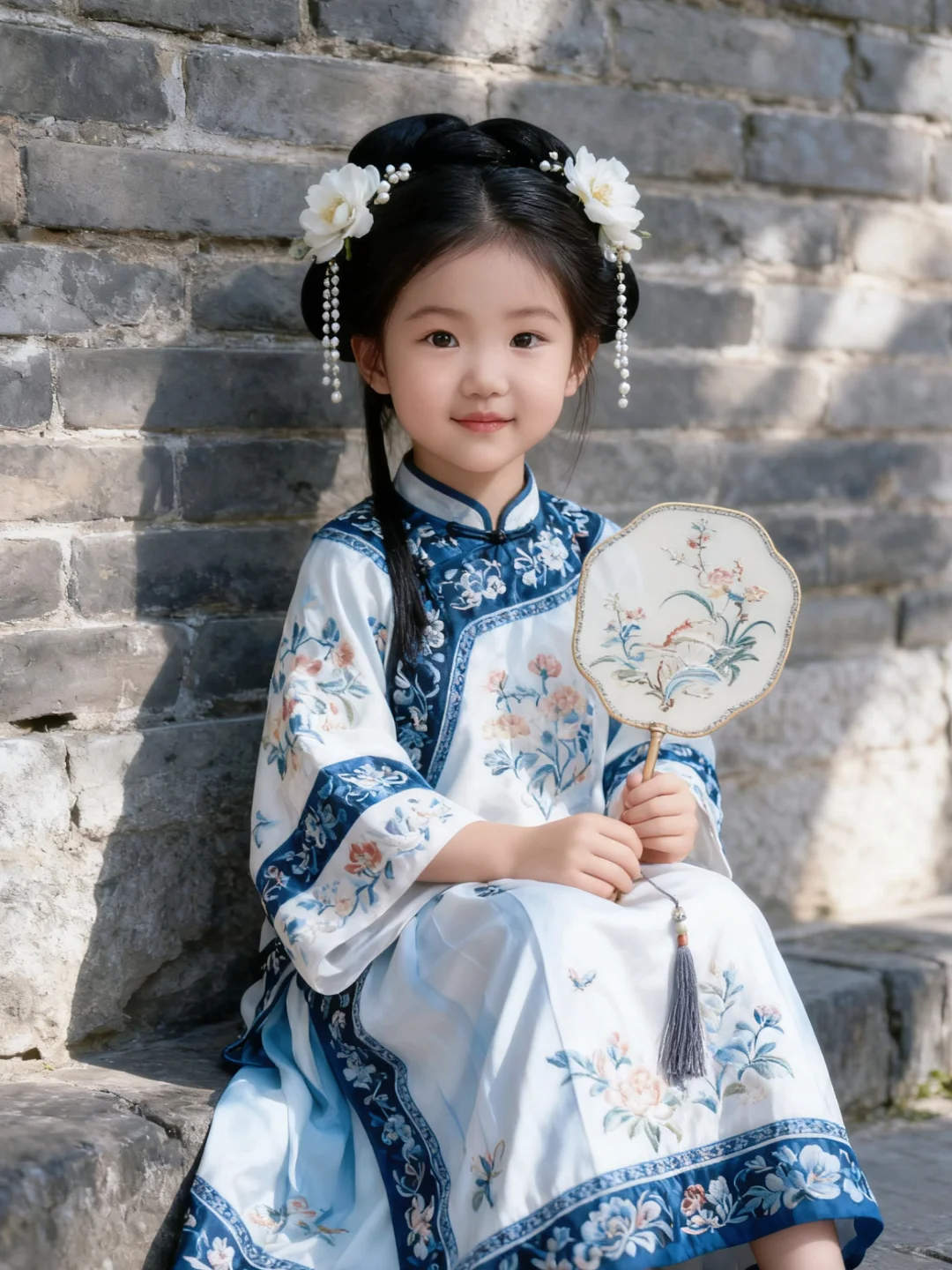 帮我生成图片:生成6张照片,去掉原背景衣物饰品,保持脸部特征不变,保持身体比例正常,皮肤通透白皙。高清人像,专业人像摄影。多视角构图,不同姿态表情不同摄影的取景角度,与整体场景相呼应。“一位10岁女孩坐在西安古旧石墙上,身着蓝白相间绣有繁花的中式长裙,裙摆和袖口边缘有精致花纹装饰。她梳着古典发髻,插戴白色花朵及珠串发饰,右手持一把绘有精美图案的团扇,扇柄坠流苏。背景是一堵灰砖墙,阳光洒下形成柔和光影。整体画面色调清新雅致,经后期调色,色彩对比鲜明,营造出温婉古典的氛围,突出人物的优雅姿态。”高级感,情绪写真,脸部补光,柔和侧光,发丝光,五官立体,陶瓷肌肤,高级去噪,高级柔光,32K细腻真人皮肤纹理,光感通透。原比例。