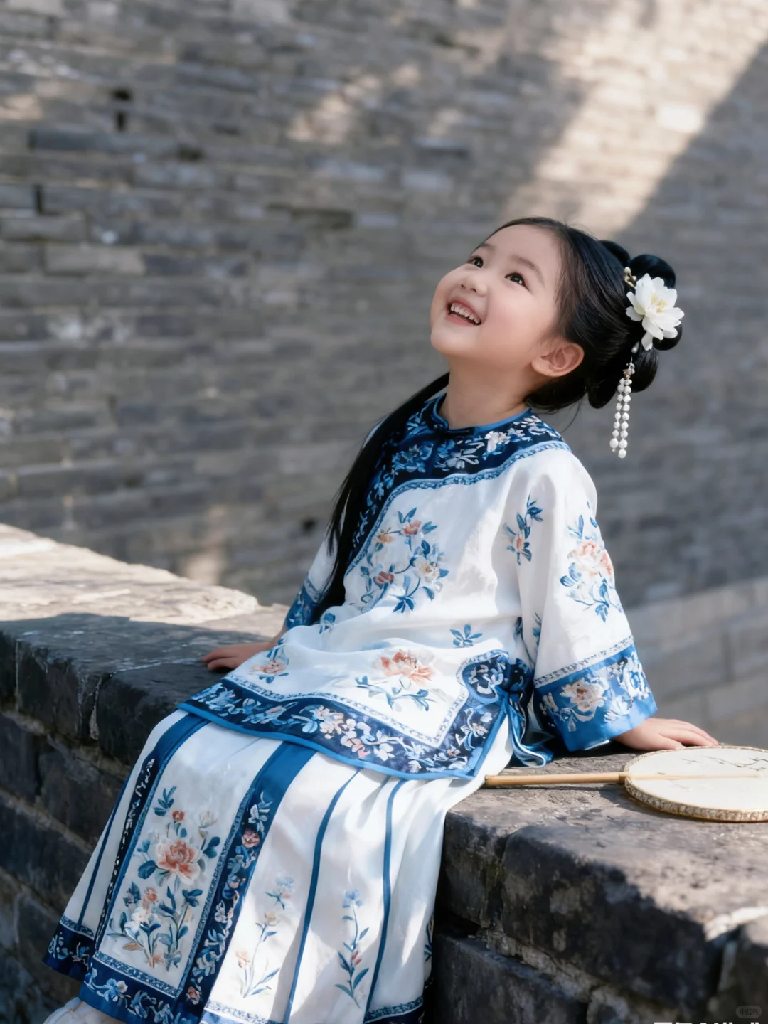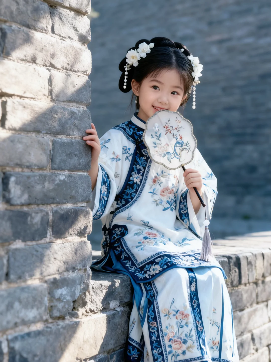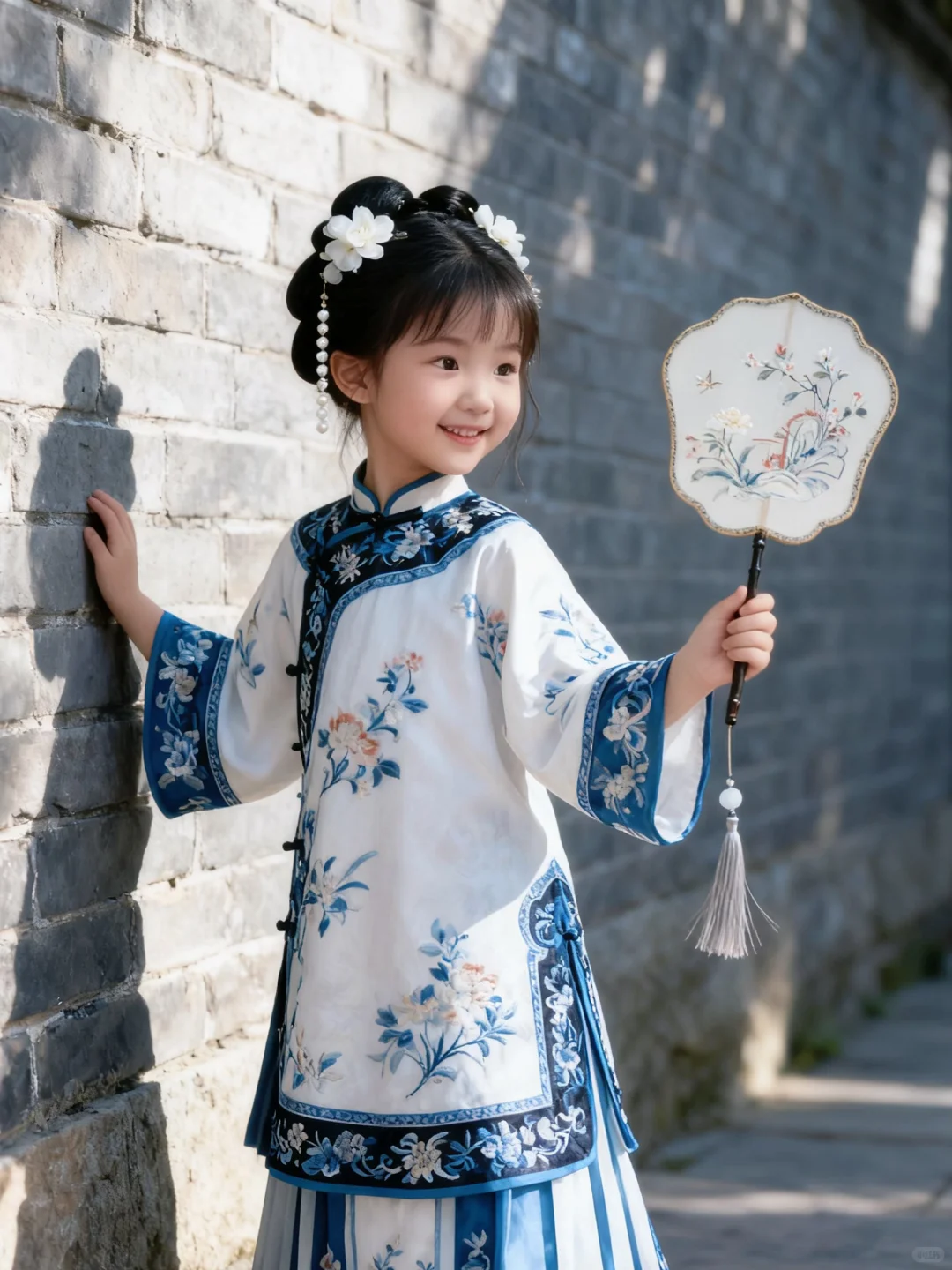 帮我生成图片:生成6张照片,去掉原背景衣物饰品,保持脸部特征不变,保持身体比例正常,皮肤通透白皙。高清人像,专业人像摄影。多视角构图,不同姿态表情不同摄影的取景角度,与整体场景相呼应。“一位10岁女孩坐在西安古旧石墙上,身着蓝白相间绣有繁花的中式长裙,裙摆和袖口边缘有精致花纹装饰。她梳着古典发髻,插戴白色花朵及珠串发饰,右手持一把绘有精美图案的团扇,扇柄坠流苏。背景是一堵灰砖墙,阳光洒下形成柔和光影。整体画面色调清新雅致,经后期调色,色彩对比鲜明,营造出温婉古典的氛围,突出人物的优雅姿态。”高级感,情绪写真,脸部补光,柔和侧光,发丝光,五官立体,陶瓷肌肤,高级去噪,高级柔光,32K细腻真人皮肤纹理,光感通透。原比例。