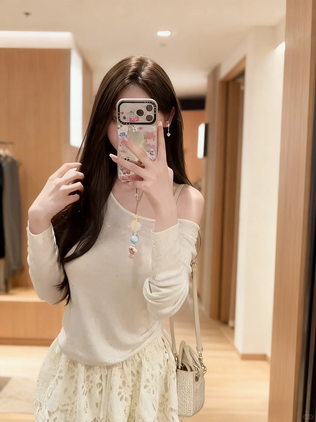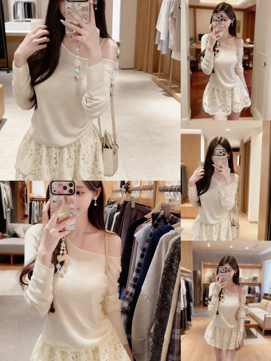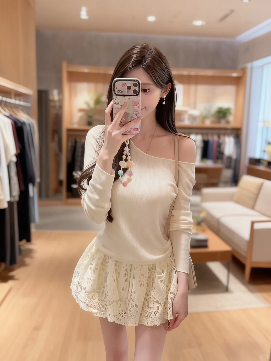 谁能拒绝这套纯欲风蕾丝套装啊!斜肩针织上衣露肩设计超绝,小露锁骨又纯又欲~搭配蕾丝短裙,甜妹感直接拉满,约会出街都被问链接🔗
