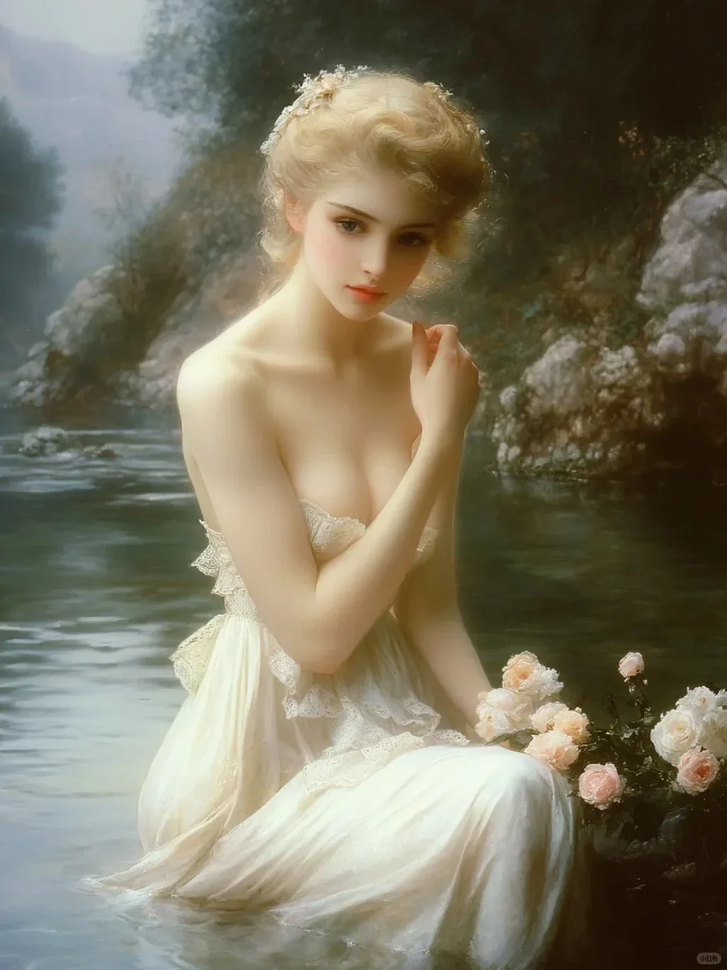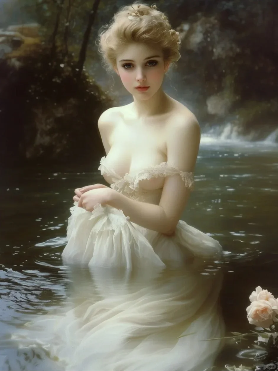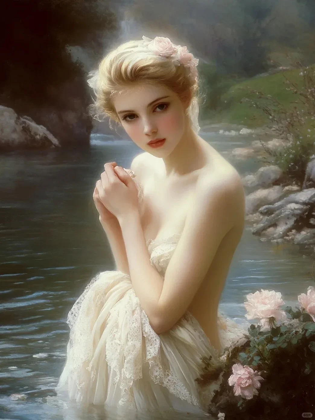 这幅作品无疑是对布格罗艺术风格的传承与致敬👍。在柔和光影里,少女肌肤细腻无暇,蕾丝与水波纹理交织,感觉伸手就能触摸到那份温暖柔软。布格罗的经典技法在画中完美延续,满是对女性之美的高度赞美~