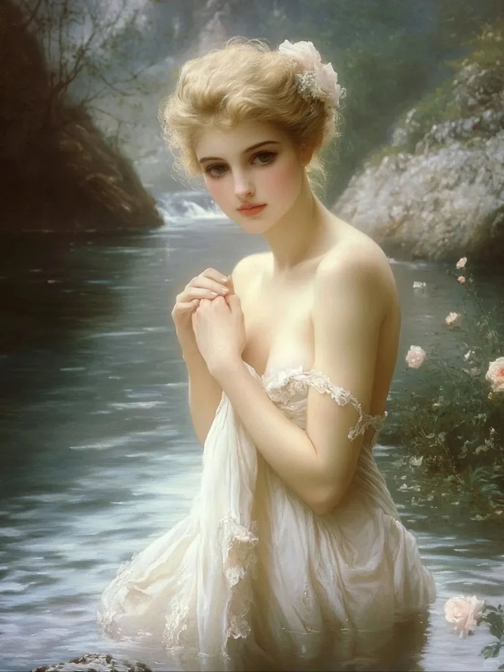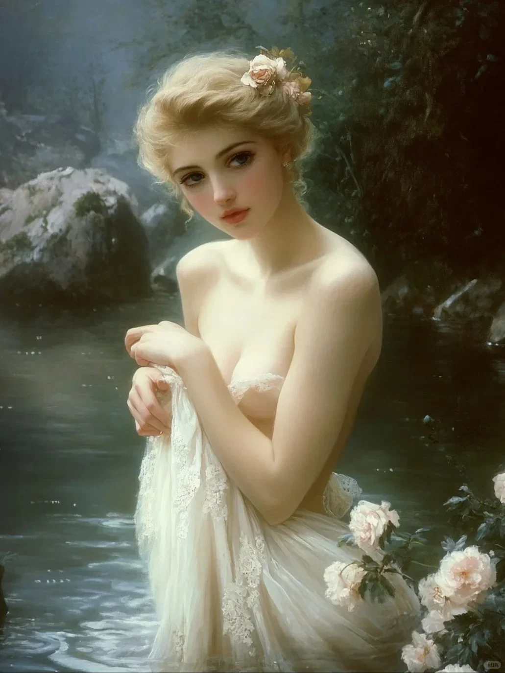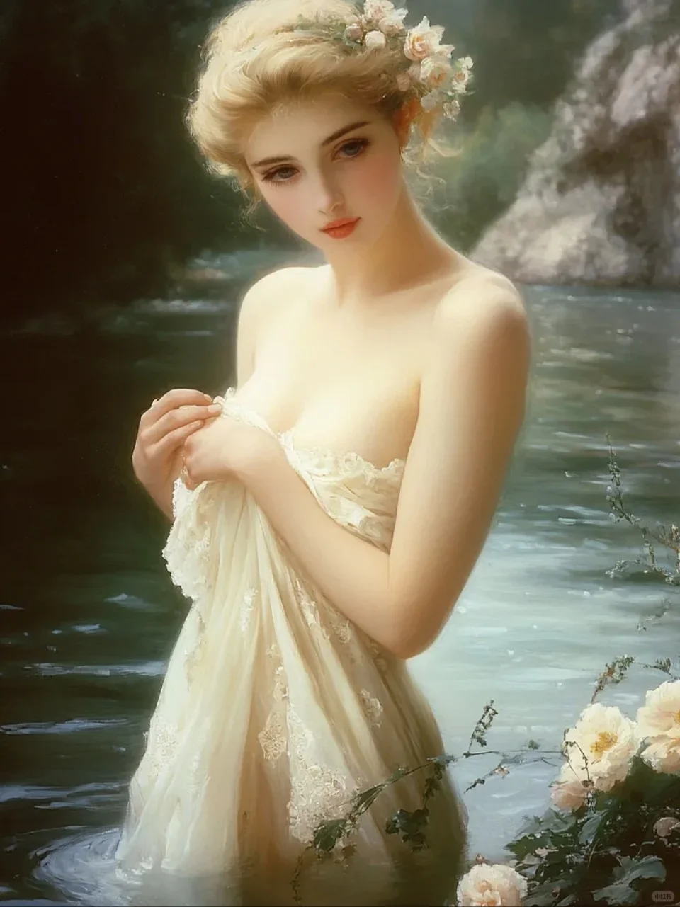 这幅作品无疑是对布格罗艺术风格的传承与致敬👍。在柔和光影里,少女肌肤细腻无暇,蕾丝与水波纹理交织,感觉伸手就能触摸到那份温暖柔软。布格罗的经典技法在画中完美延续,满是对女性之美的高度赞美~