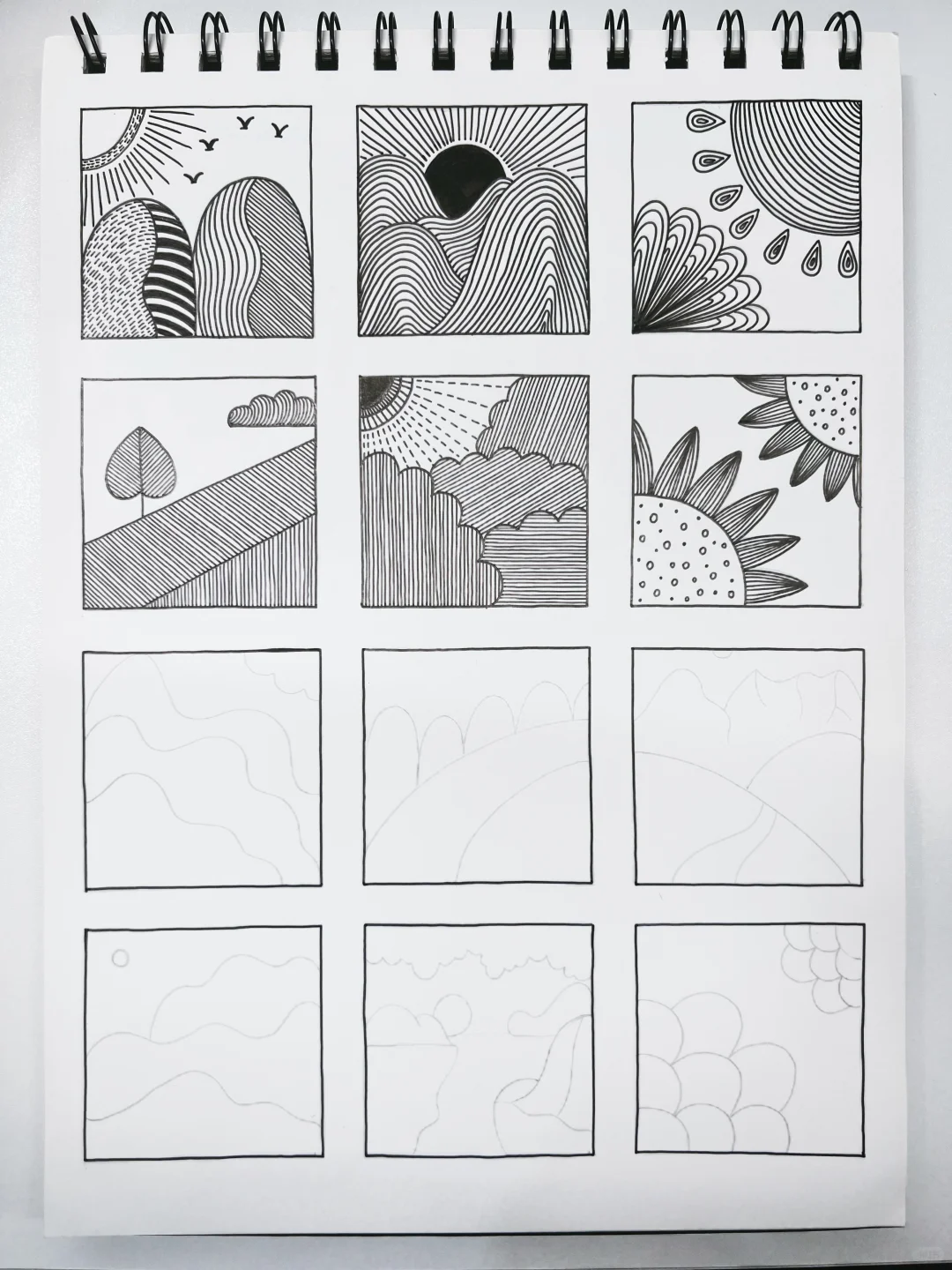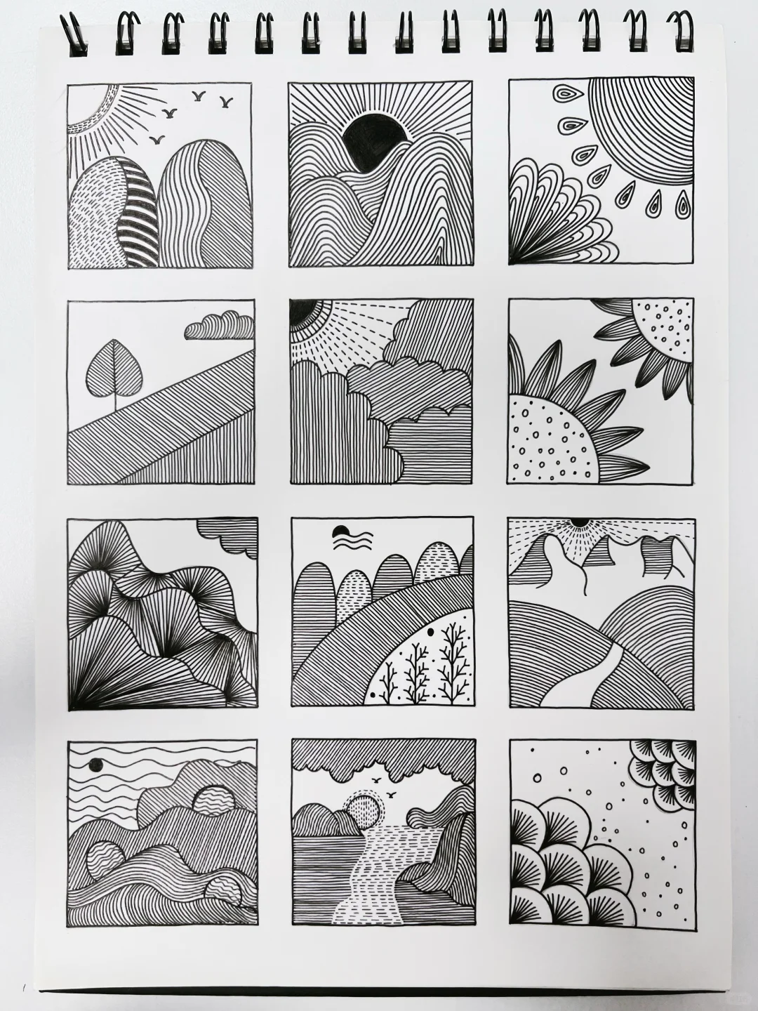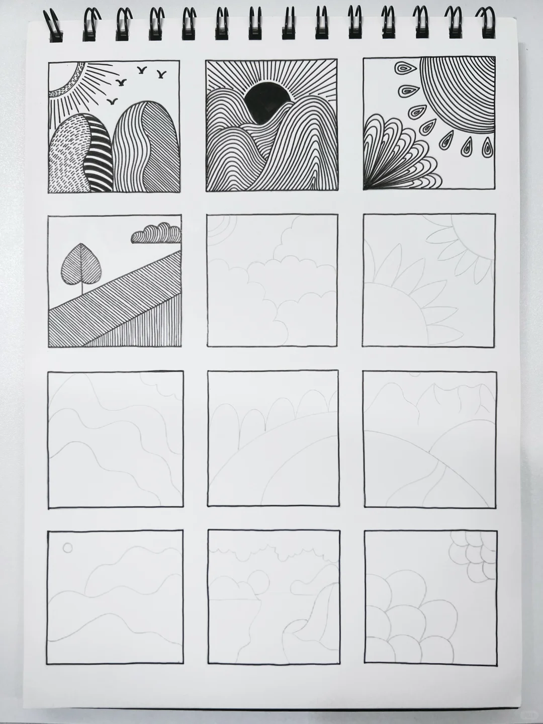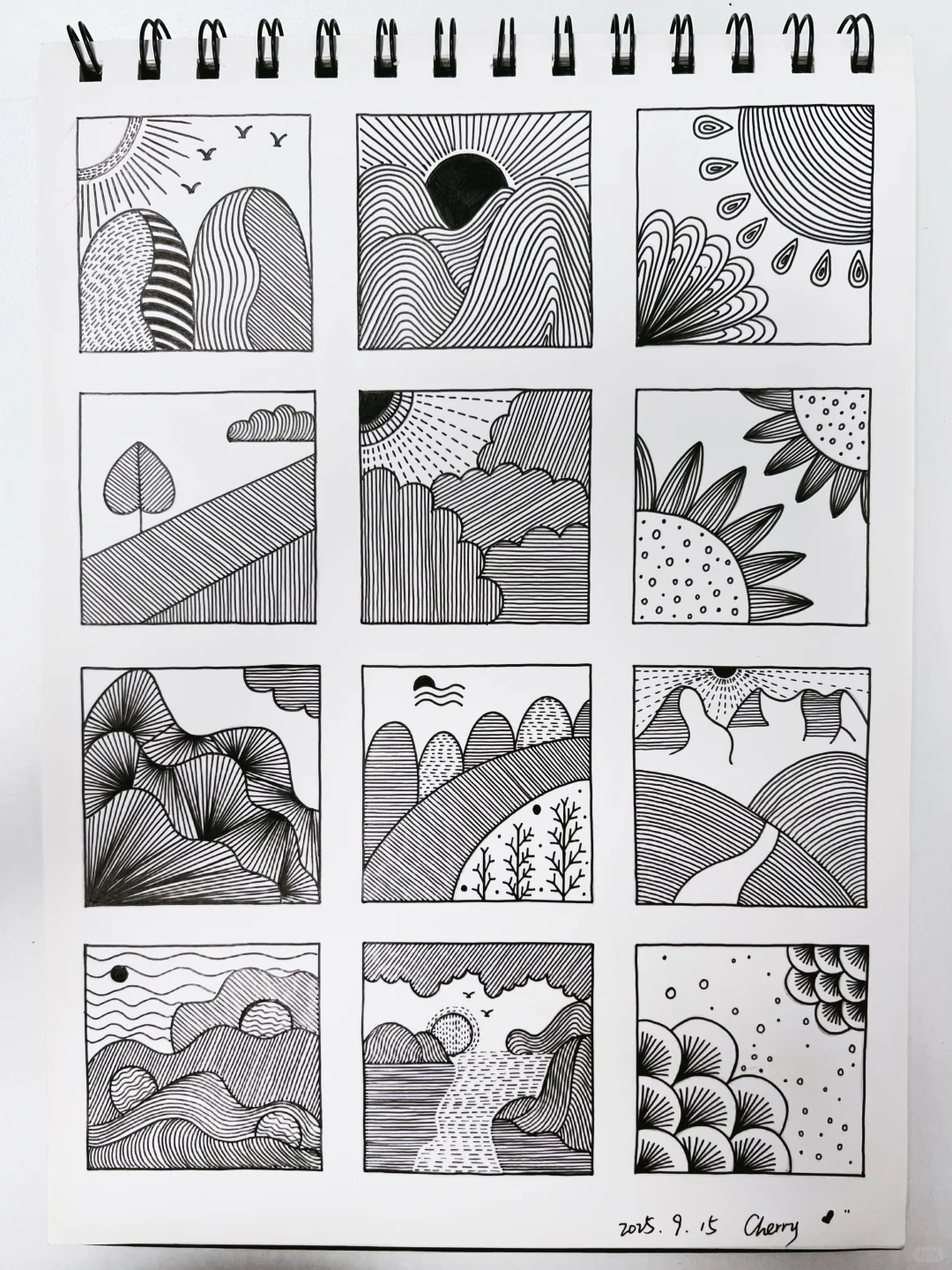 每一幅都藏着不同的线条语言——波浪线的山峦、放射状的阳光、点状的装饰……简单的黑白,却因线条的疏密、曲直变化,让每一格都有了独特的呼吸感🌄
