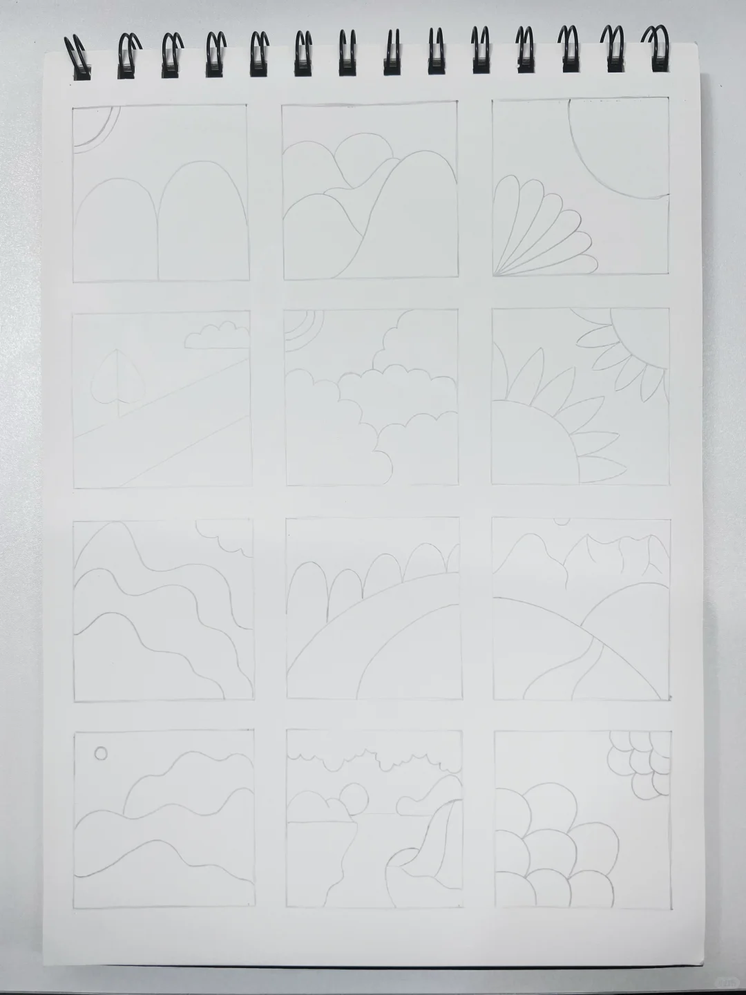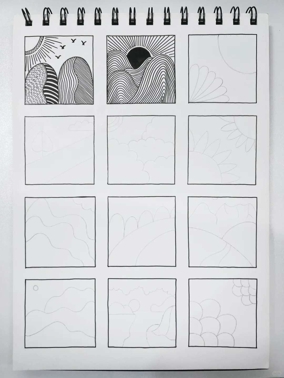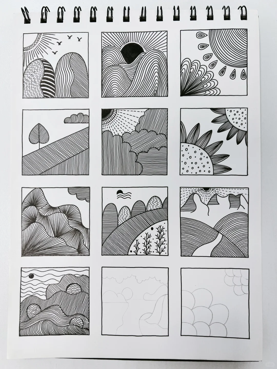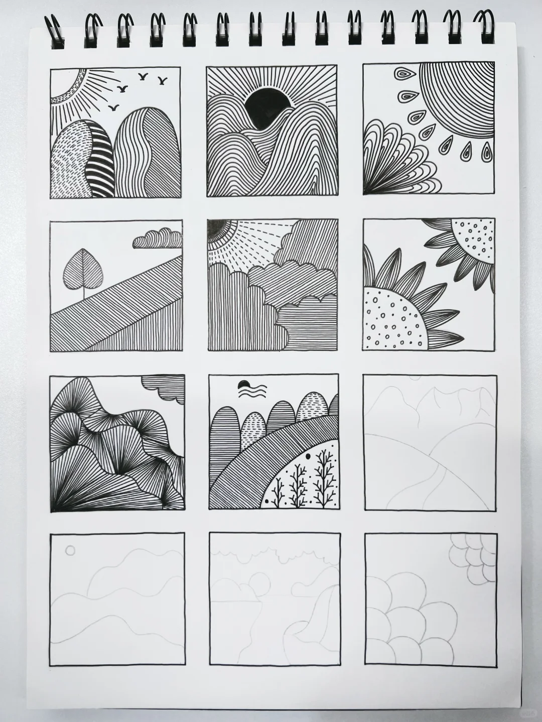 每一幅都藏着不同的线条语言——波浪线的山峦、放射状的阳光、点状的装饰……简单的黑白,却因线条的疏密、曲直变化,让每一格都有了独特的呼吸感🌄
