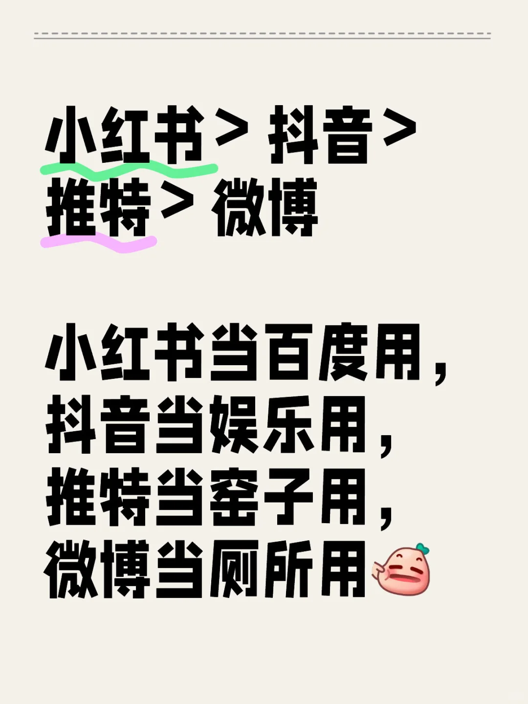 小红书当百度用,抖音当娱乐用,推特当窑子用,微博当厕所用