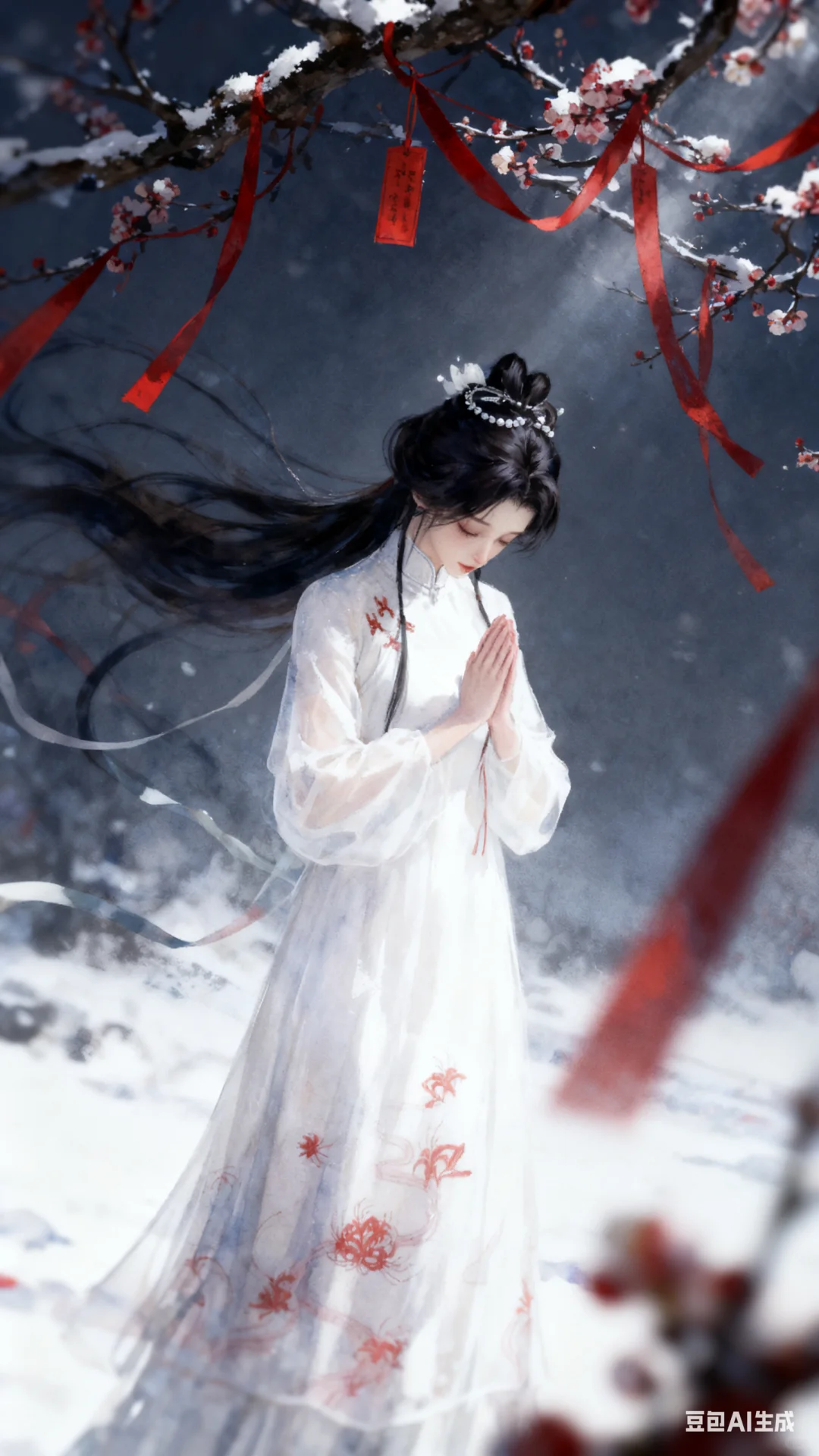 4️⃣ 参考图中人物发型和服饰生成,完整保留图中角色的长相发型和服饰包括发饰。白雪,红梅,女,长发,飘带,古风,氛围感,站立,低头闭目,双手握在胸前做许愿姿势,树枝头挂着红色的许愿飘带,镜头从下往上。华丽人物插画,晕染,厚涂,水彩,二次元风格,清冷感,宿命感,唯美主义,光影美学,超高清,高细节,究极细节,细节高级完美,杰作,立体感,柔焦,绝美光影,淡彩,磨砂肌理,双重曝光,暗调与高曝,浅景深,氛围感,动感模糊,梦核,极简,极端构图,层次感,大师级光影,极致光线,清透细腻渲染。