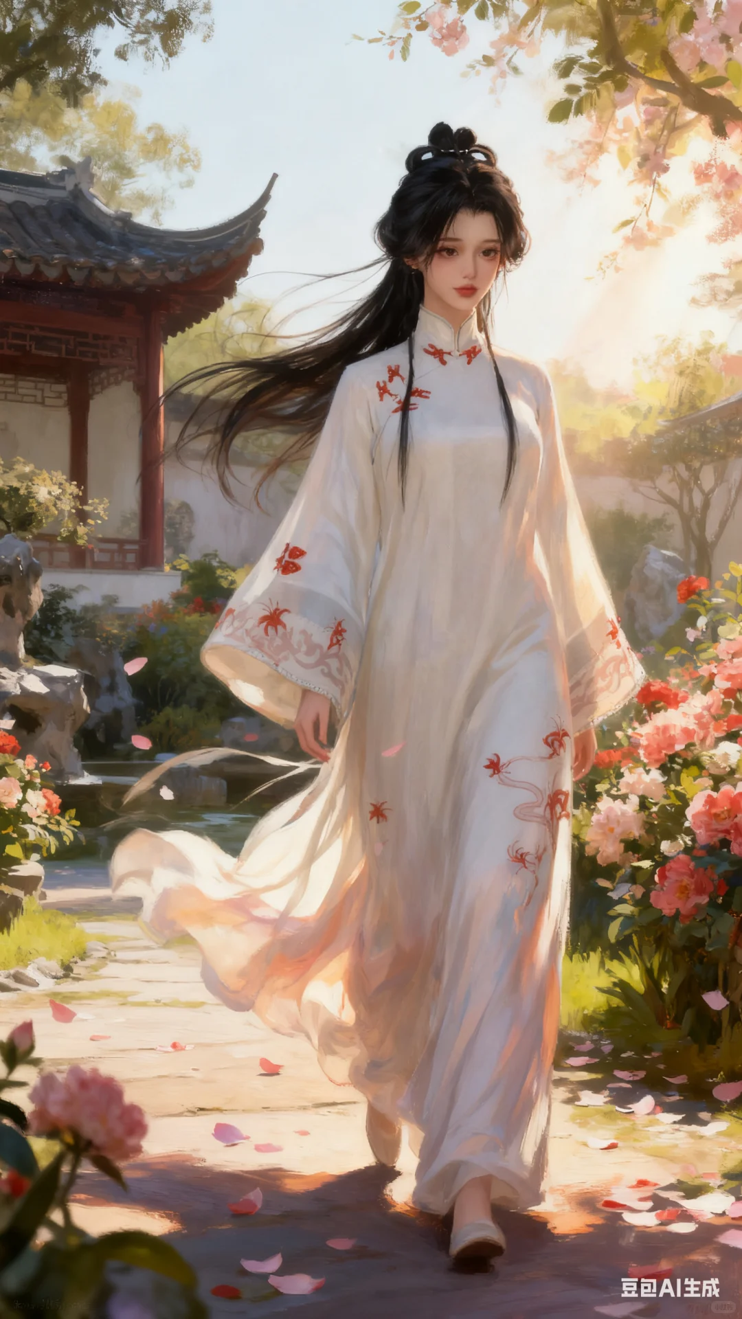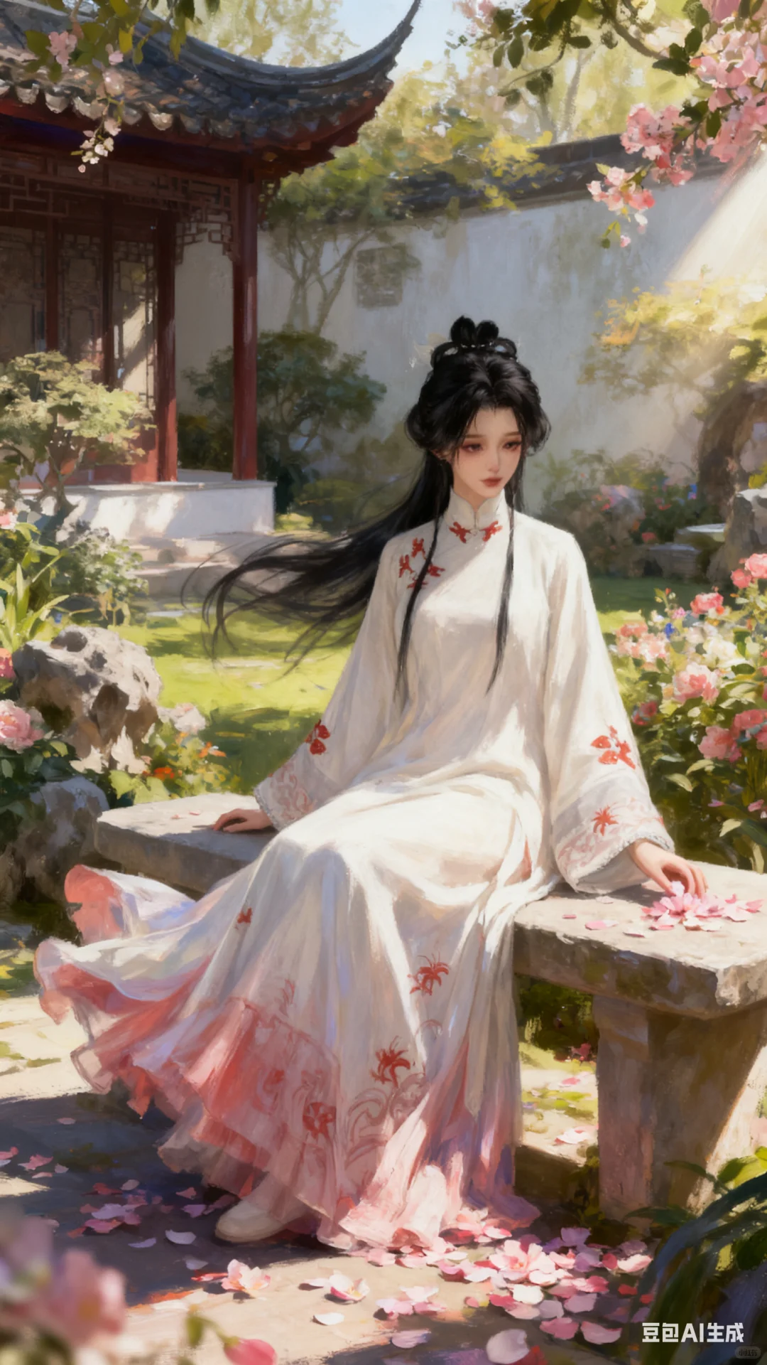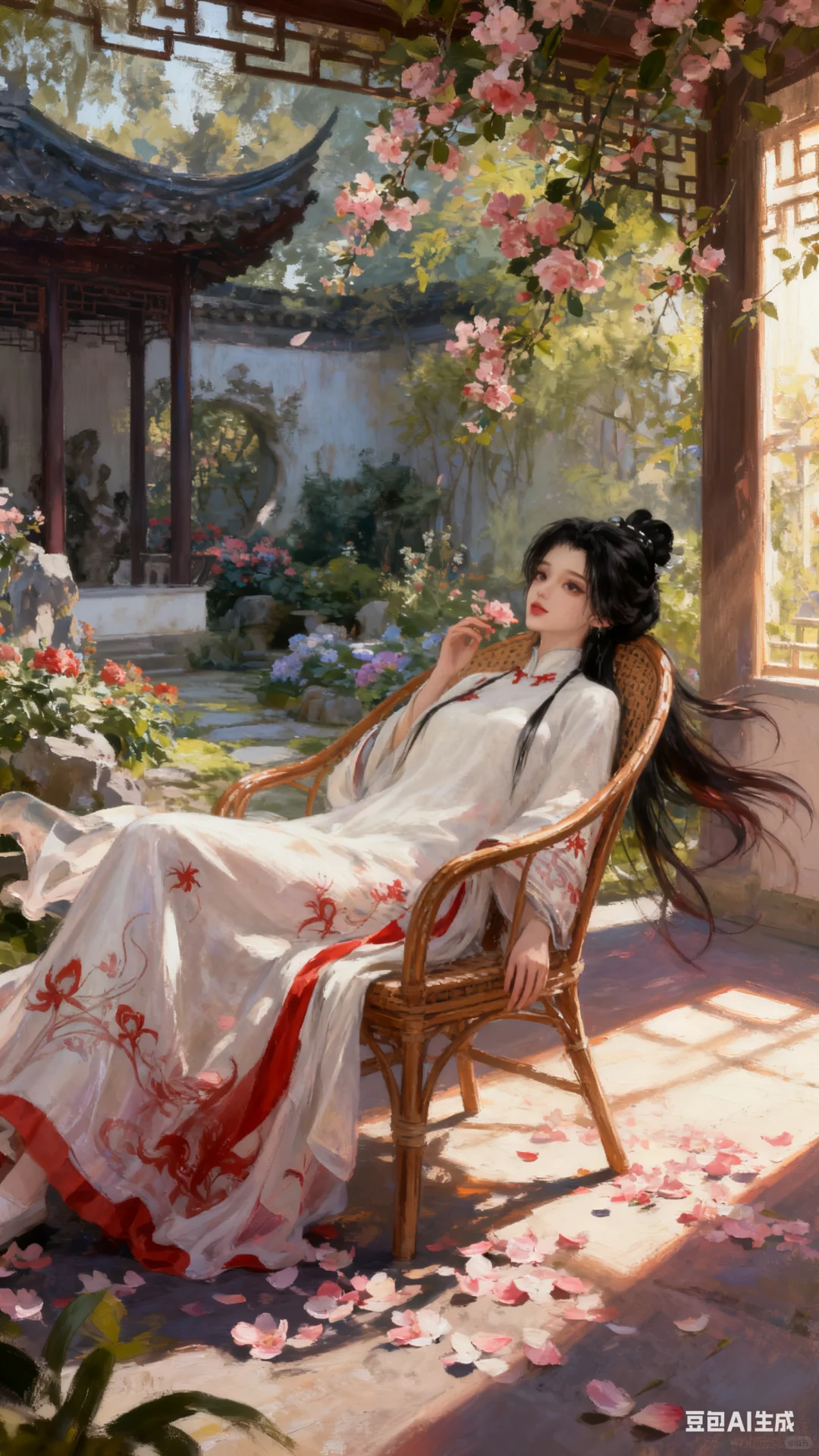1️⃣➡️3️⃣ 参考 Wlop的画风,根据图片服饰、面容形成,采用浪漫唯美且富有层次感的色调,色彩饱和度唯美浪漫且过渡自然,营造出强烈的视觉冲击力与浪漫氛围。人物的发丝、服饰纹理等细节都刻画得十分细腻,线条流畅且富有质感,展现出高精度的绘制水准。运用柔和且富有氛围感的光影,光线从画面右侧洒入,形成明暗对比,增强了画面的立体感和层次感,让人物和场景更具生动性。画面呈现出细腻的油画质感,笔触柔和且富有艺术感。人物在中式园林后花园中躺在藤椅上赏花,满地落下的花瓣,裙摆随风摆动,发丝随风飘逸。人物面容不变,不要出现面容错误,不要出现手指错误,目光自然,服装不变。三张不同姿势图片,图片比例9:16。