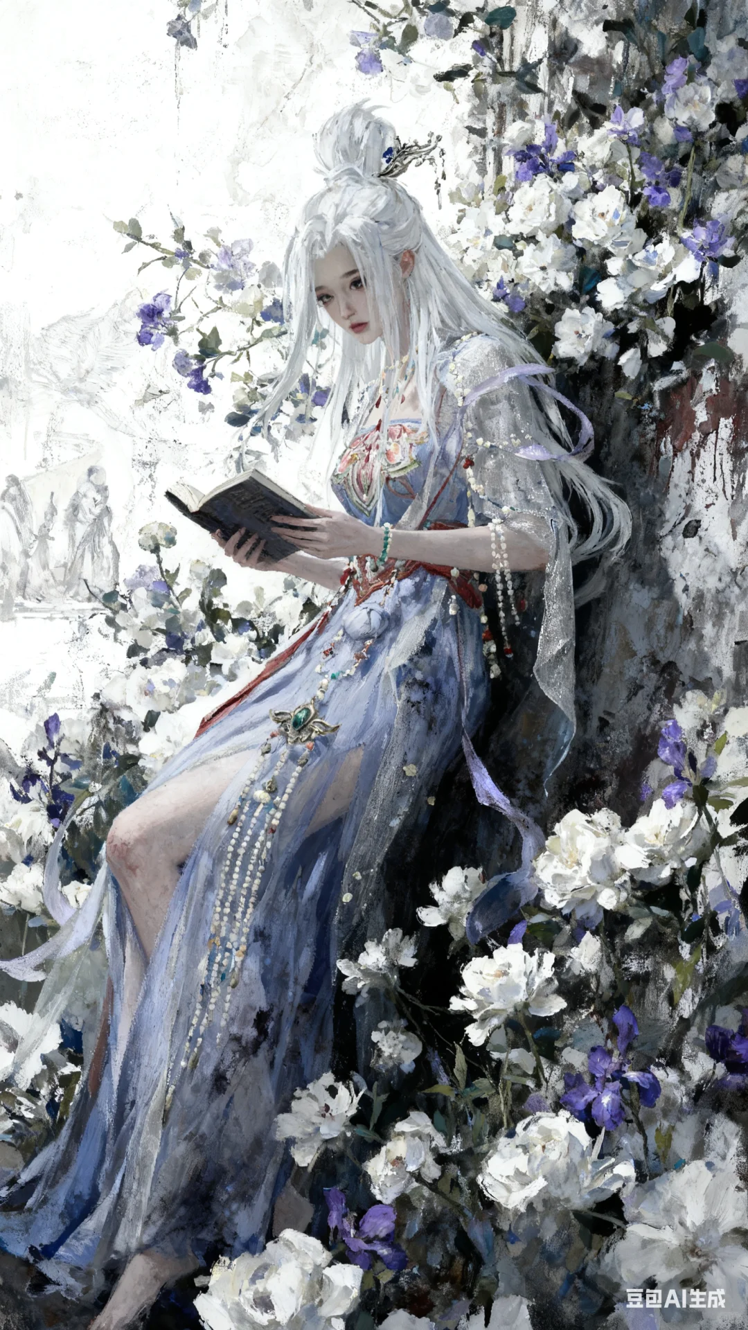 5️⃣ 帮我完整保留人物发型 发饰 衣服版型,风格为国风 超高细节 柔软流畅且细节达到超高程度的超古风主义画,画面有精致的花卉,繁华的白色与紫色的鲜花 搭配着带有故事氛围的元素,营造出阴郁病娇的场景风格。人物在花海中 人物主体手持一本书,静静地倚靠着花墙。构图运用动态角度,画面以白色和淡蓝色为主,运用厚涂和晕染水粉的技法,使画面呈现出颜料涂抹的质感,充满了颗粒感和肌理感。*️⃣鲜花颜色按照自己衣服色系调整