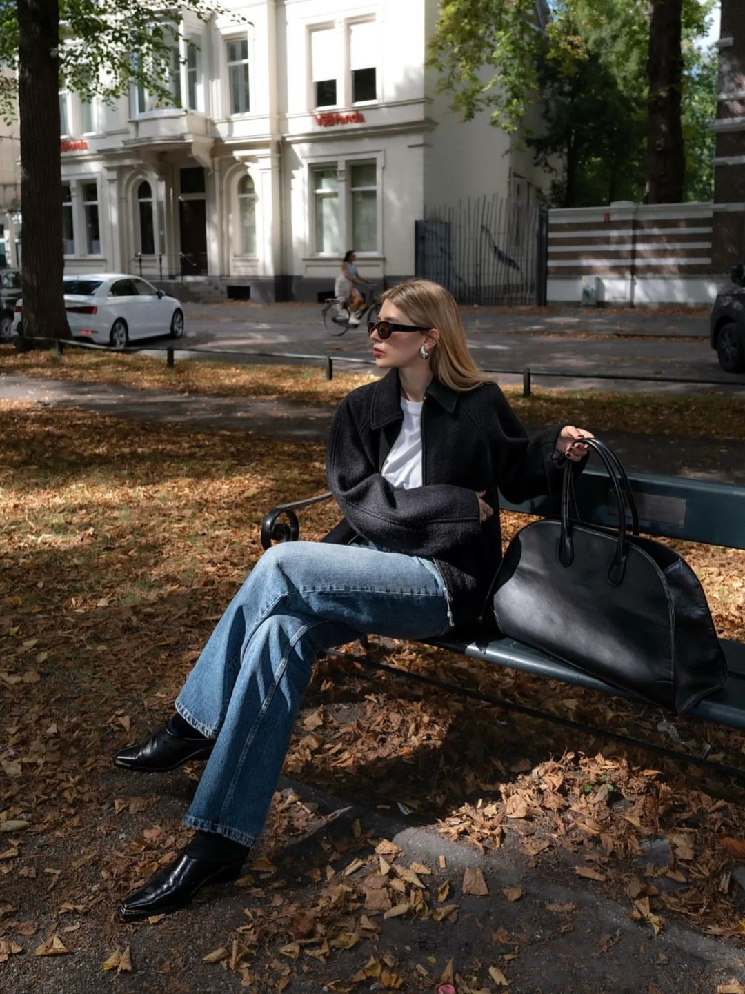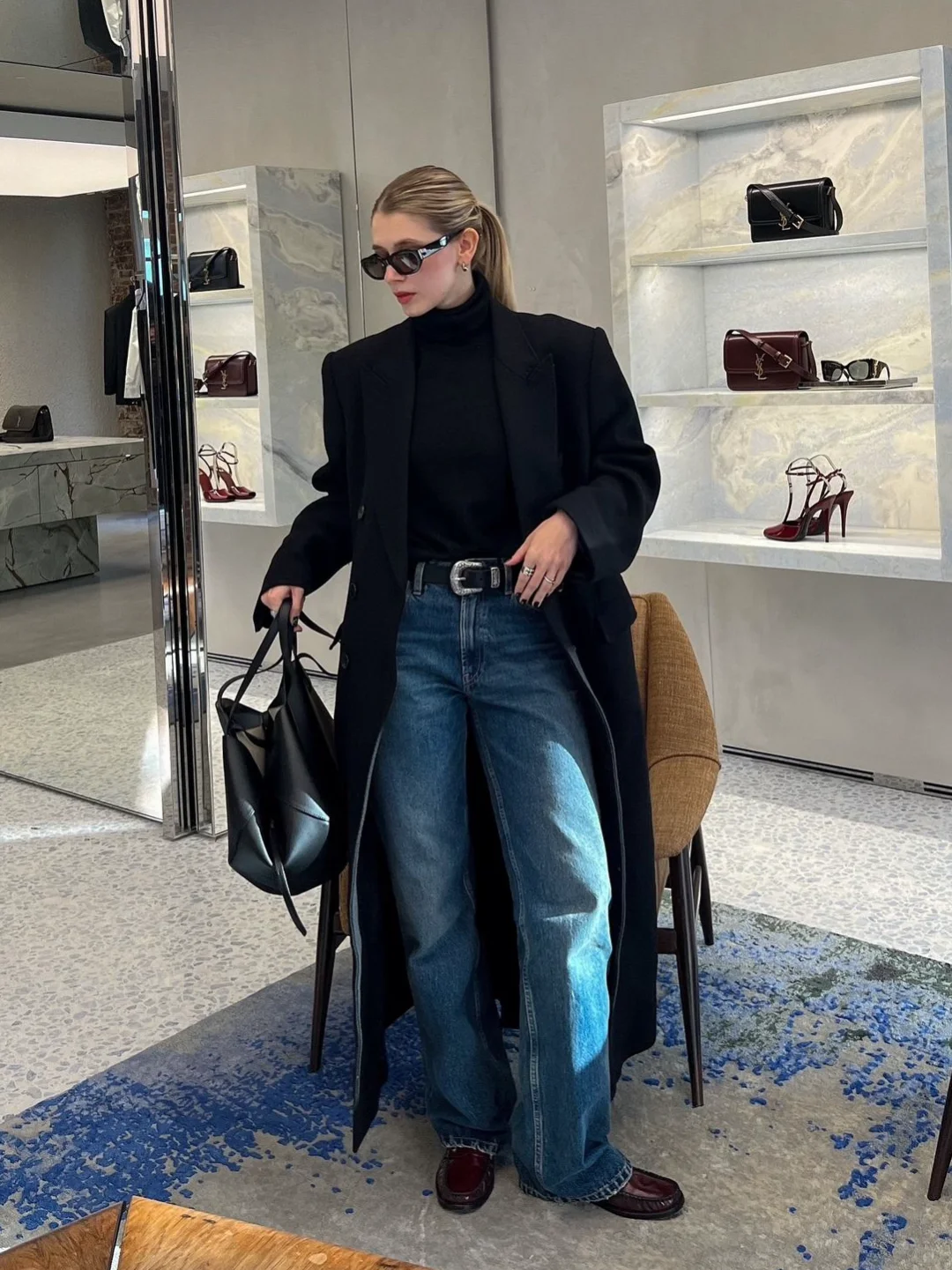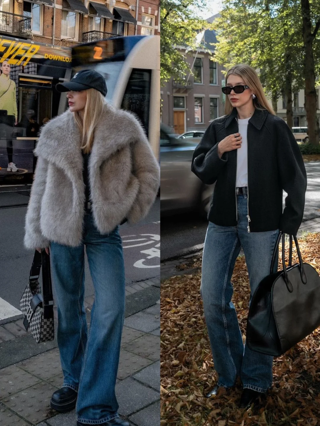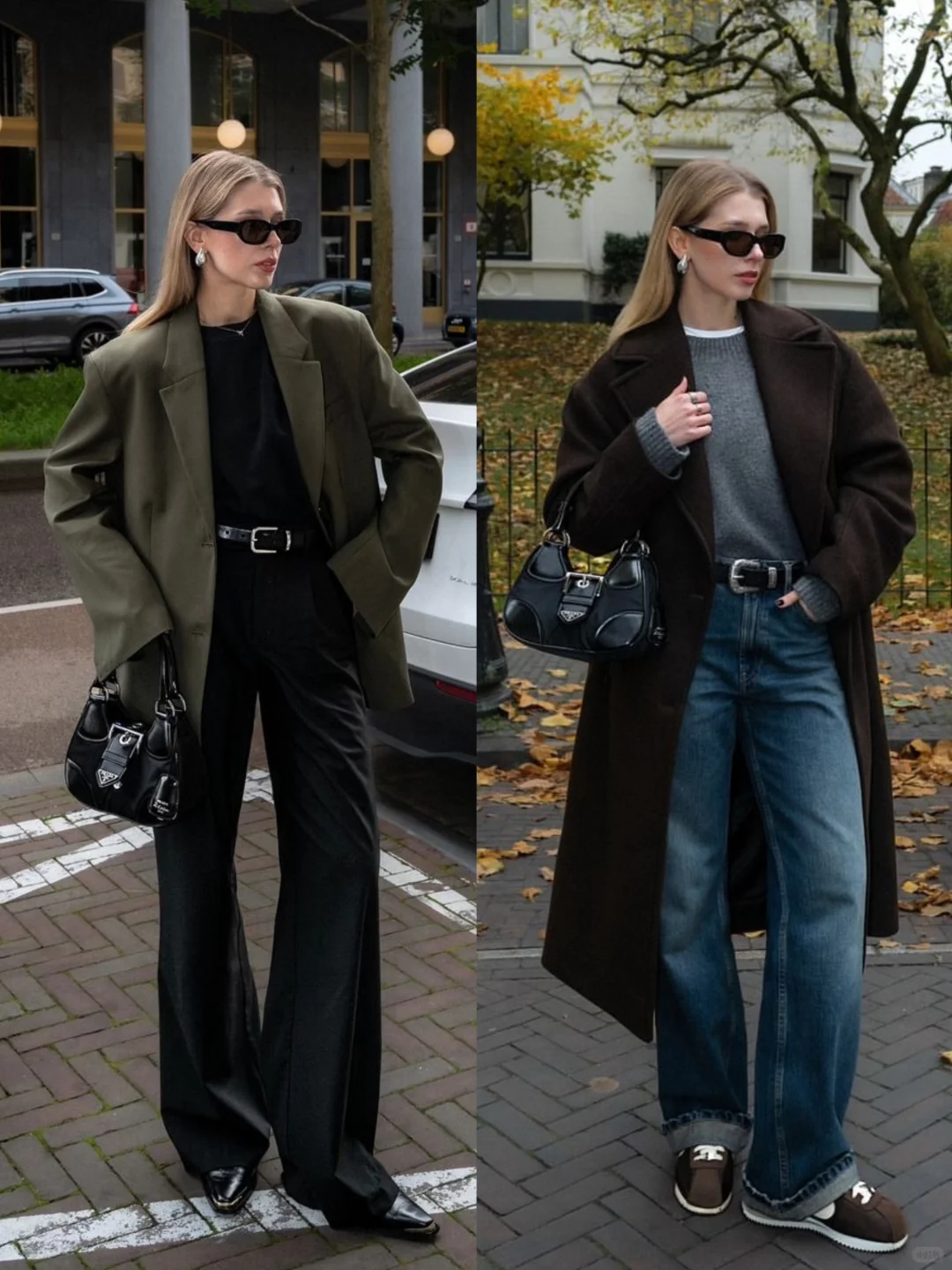 【秋冬基础单品】:长款大衣、灰色毛衣、西装、蓝色牛仔裤、灰色阔腿裤、短款外套