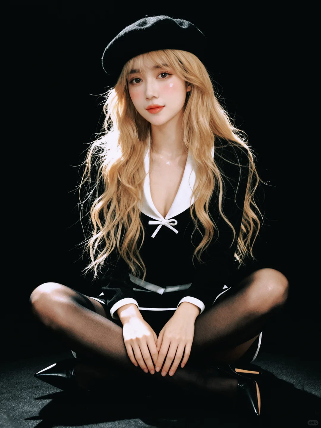 • 黑色贝雷帽、上衣、丝袜、鞋子是“实穿黑”,撑起造型的复古基调;