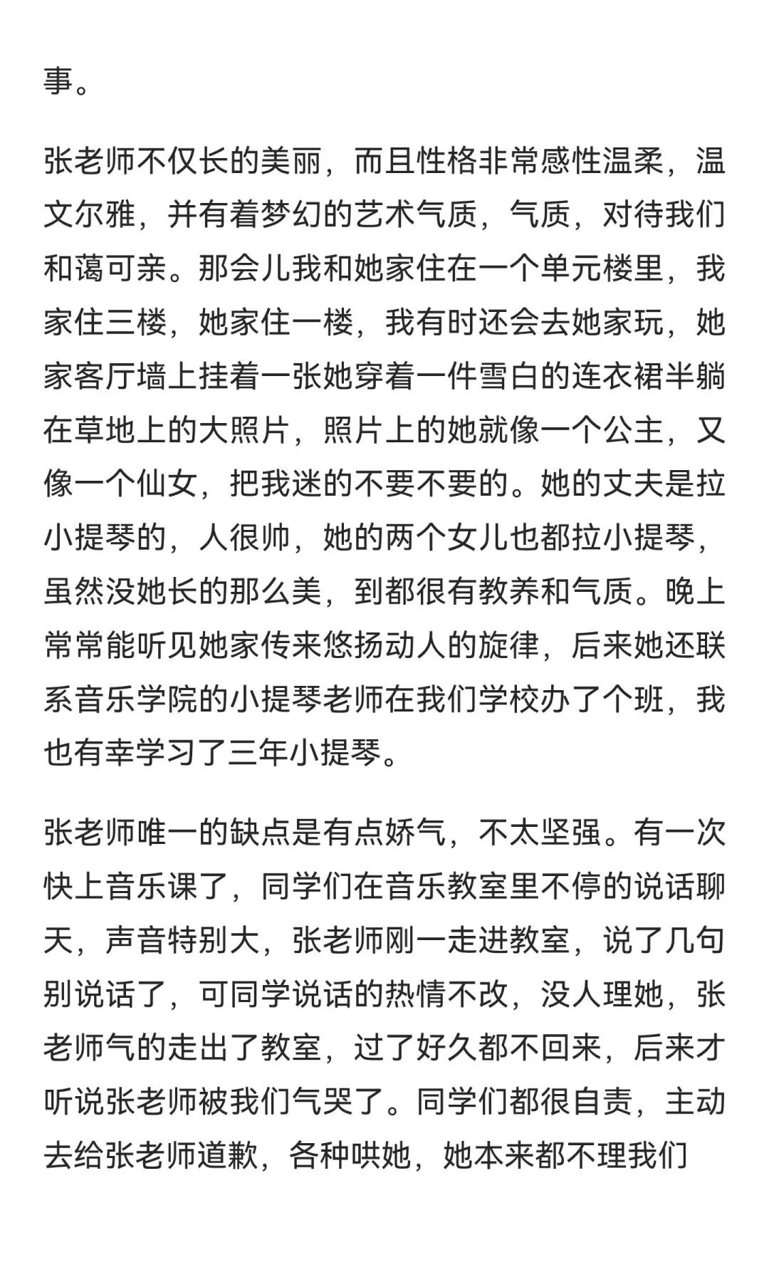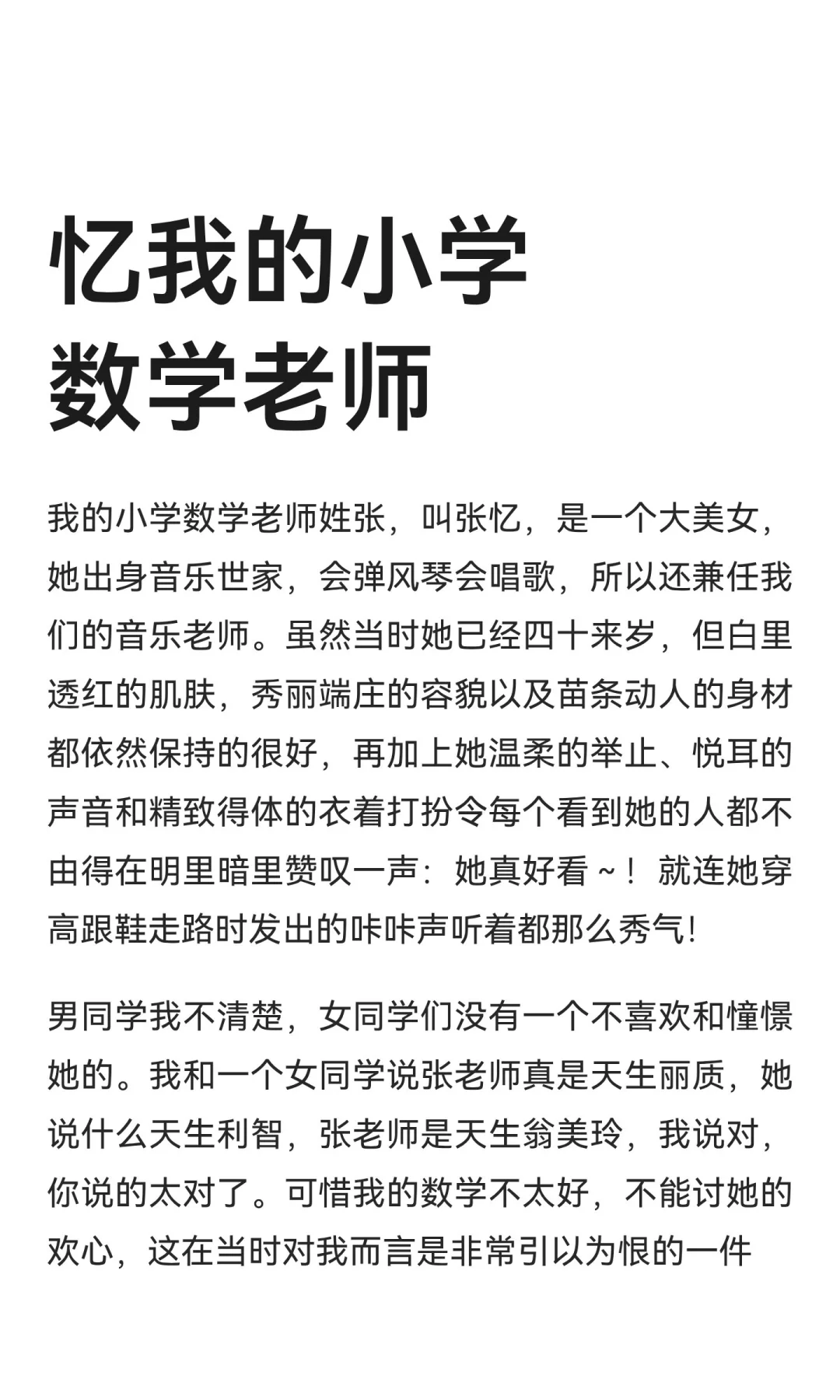 我的小学数学老师张忆,美丽温柔,兼任音乐老师,气质出众。她出身音乐世家,丈夫和女儿都擅长小提琴,家中常有音乐声。虽娇气,但被学生深深喜欢和爱戴。