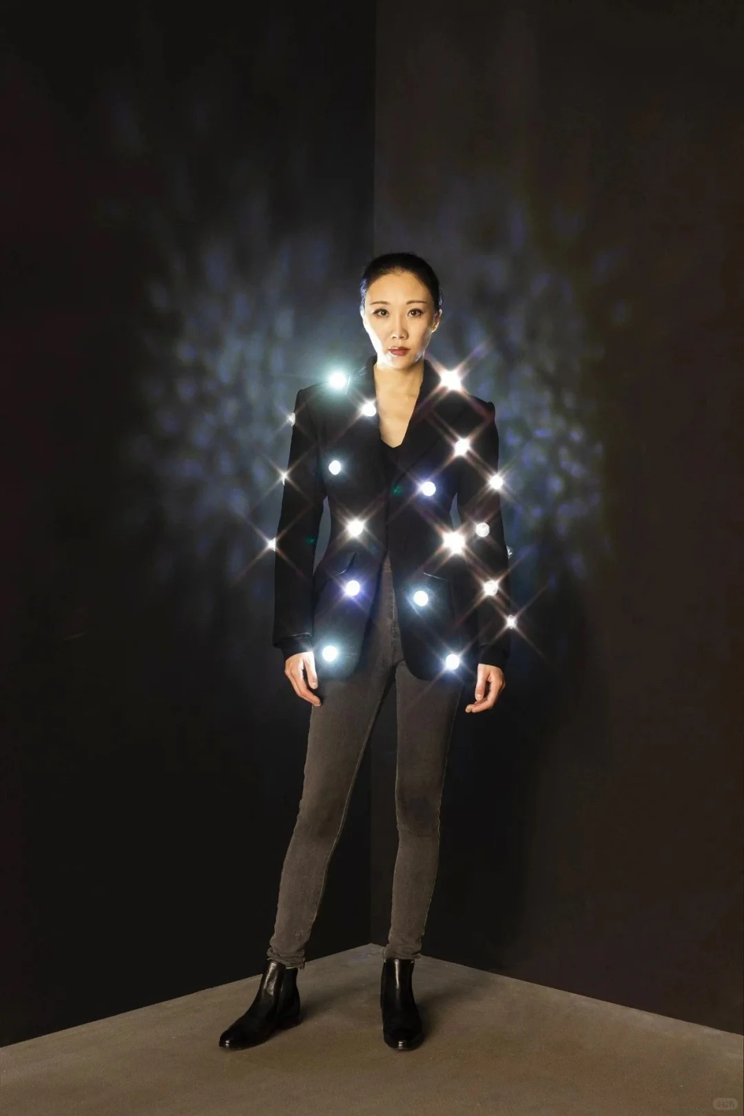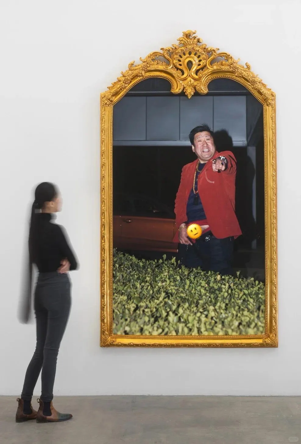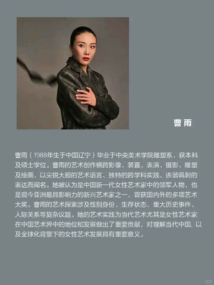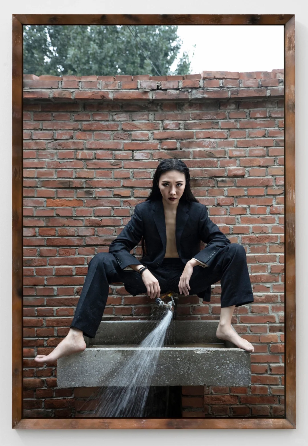 曹雨的作品也有反思女性在父权社会中的立场:系列作品《尤物》将镜头对准公共场合中撒尿的男人们。这组真人等大相片被安置在金色巴洛克相框中,更凸显了作品的荒诞。有着艺术家肖像的作品《龙头》,也能看到《尤物》的影子:她身着黑色西服,目光锐利,头发披散,双腿分开坐在水龙头上,水从双腿间挑衅地喷射而出。“她说,任何人,都可以忘掉性别的束缚,放肆地创造。就像作品中龙头里的水,在水龙头‘坏了’之后,却反而迸发出最原始的生命力,腾空跃过水槽,在未来汇聚成洪流。”