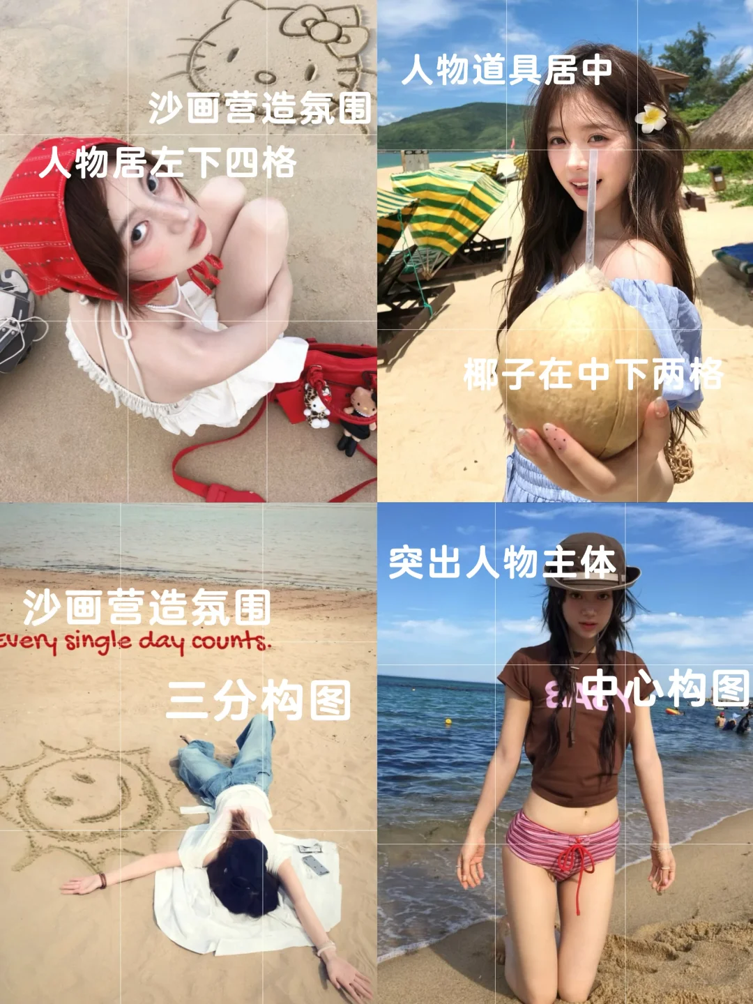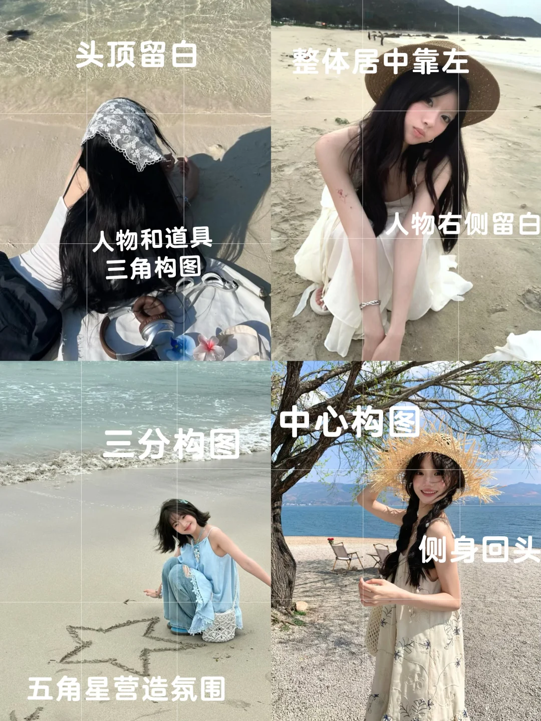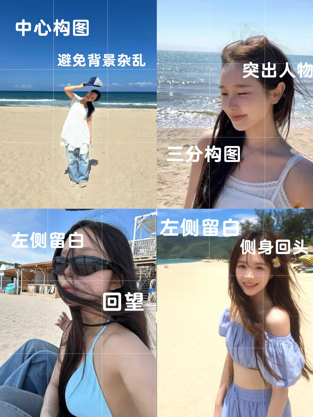 2️⃣中心构图:让她站画面中心,聚焦人物,海浪沙滩当温柔背景,突出氛围感