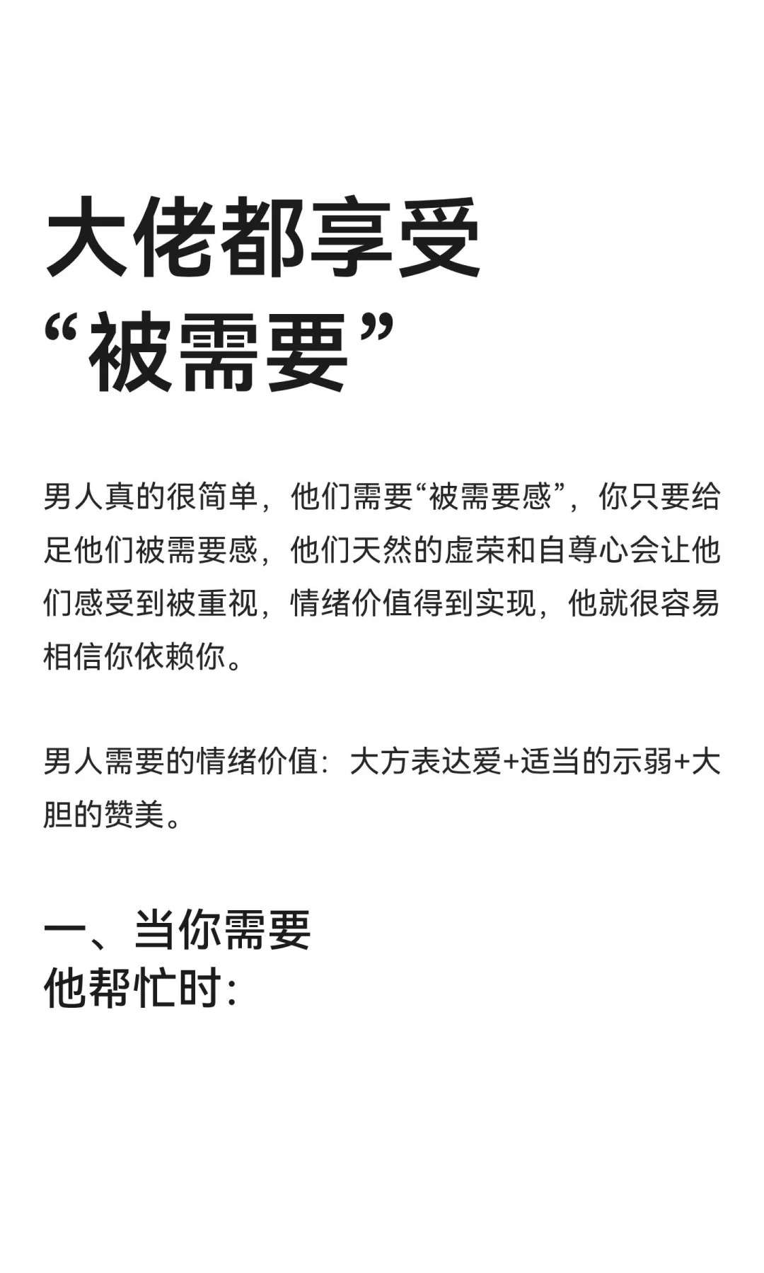 男人真的很简单,他们需要“被需要感”,你只要给足他们被需要感,他们天然的虚荣和自尊心会让他们感受到被重视,情绪价值得到实现,他就很容易相信你依赖你。