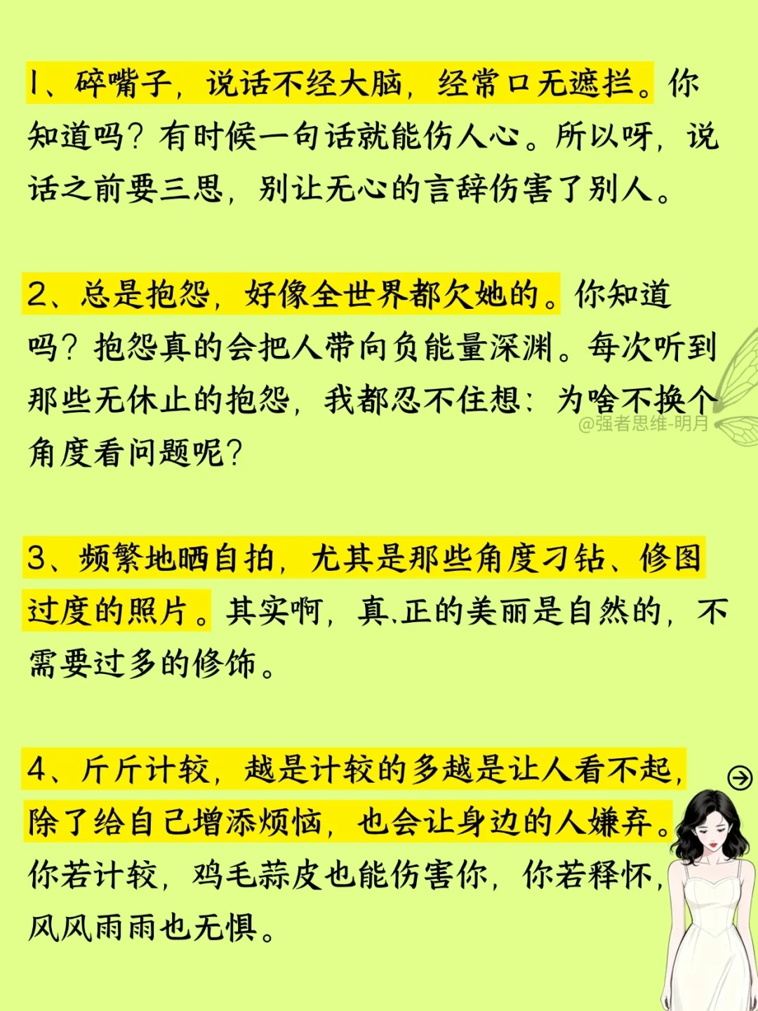 2、总是抱怨,好像全世界都欠她的。你知道吗?抱怨真的会把人带向负能量深渊。每次听到那些无休止的抱怨,我都忍不住想:为啥不换个角度看问题呢?