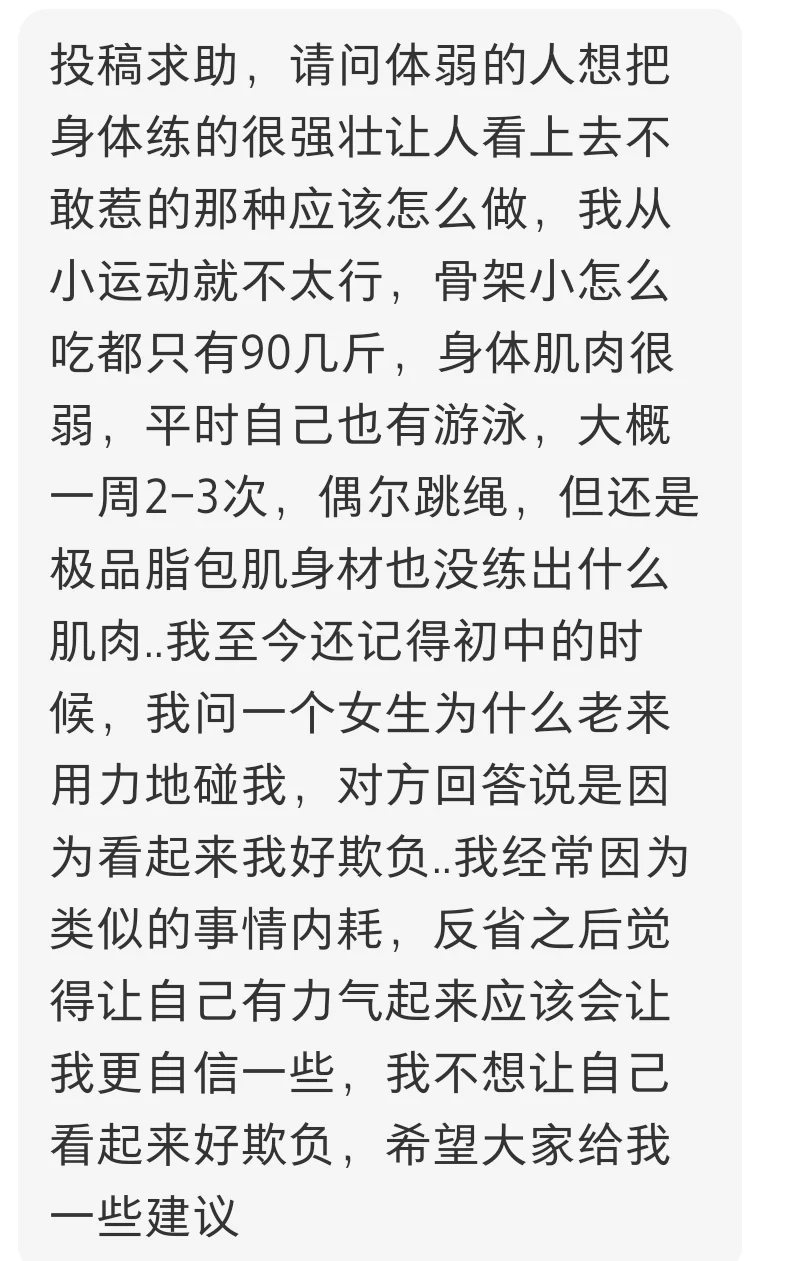Q2:投稿求助,请问体弱的人想把身体练的很强壮让人看上去不敢惹的那种应该怎么做,我从小运动就不太行,骨架小怎么吃都只有90几斤,身体肌肉很弱,平时自己也有游泳,大概一周2-3次,偶尔跳绳,但还是极品脂包肌身材也没练出什么肌肉..我至今还记得初中的时候,我问一个女生为什么老来用力地碰我,对方回答说是因为看起来我好欺负..我经常因为类似的事情内耗,反省之后觉得让自己有力气起来应该会让我更自信一些,我不想让自己看起来好欺负,希望大家给我一些建议
