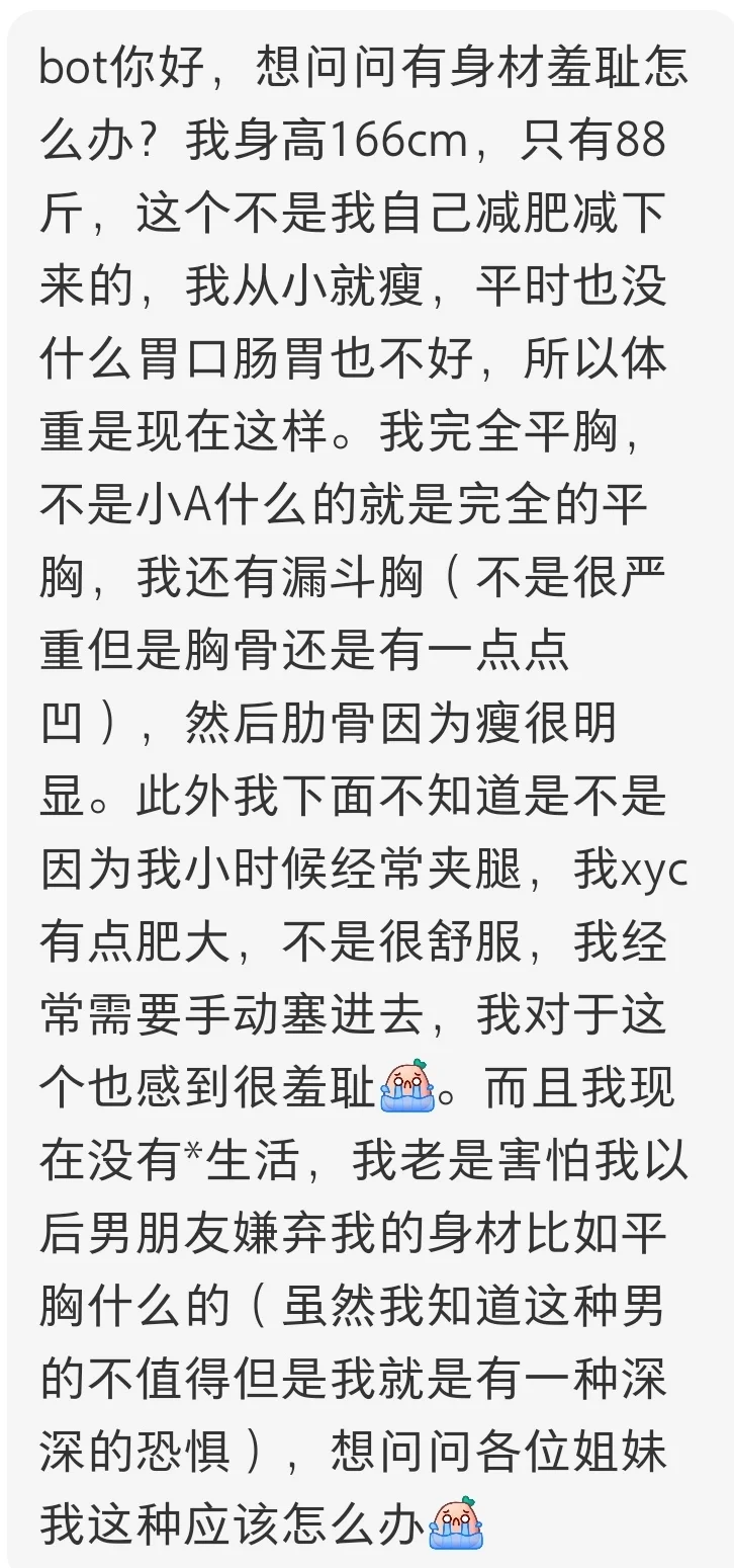 Q1:bot你好,想问问有身材羞耻怎么办?我身高166cm,只有88斤,这个不是我自己减肥减下来的,我从小就瘦,平时也没什么胃口肠胃也不好,所以体重是现在这样。我完全平胸,不是小A什么的就是完全的平胸,我还有漏斗胸(不是很严重但是胸骨还是有一点点凹),然后肋骨因为瘦很明显。此外我下面不知道是不是因为我小时候经常夹腿,我xyc 有点肥大,不是很舒服,我经常需要手动塞进去,我对于这个也感到很羞耻。而且我现在没有,我老是害怕我以后男朋友嫌弃我的身材比如平胸什么的(虽然我知道这种男的不值得但是我就是有一种深深的恐惧),想问问各位姐妹我这种应该怎么办