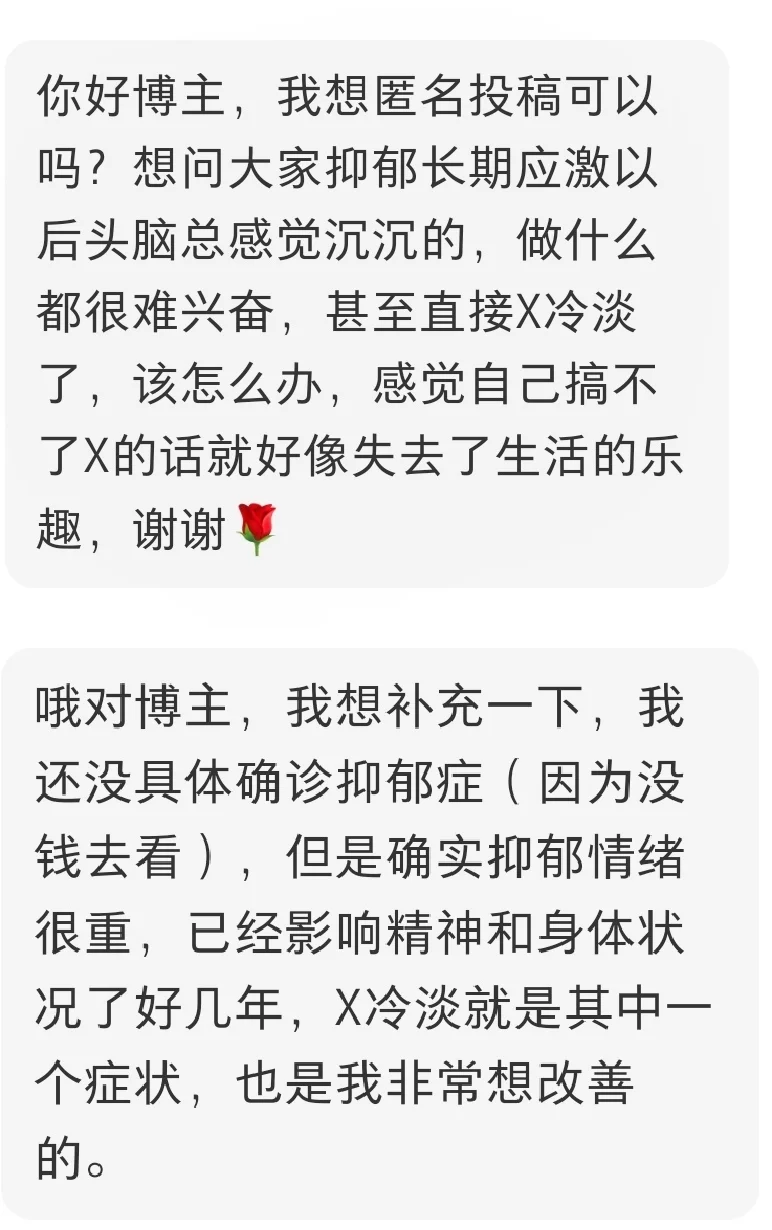 哦对博主,我想补充一下,我还没具体确诊抑郁症(因为没钱去看),但是确实抑郁情绪很重,已经影响精神和身体状况了好几年,X冷淡就是其中﹣个症状,也是我非常想改善的。