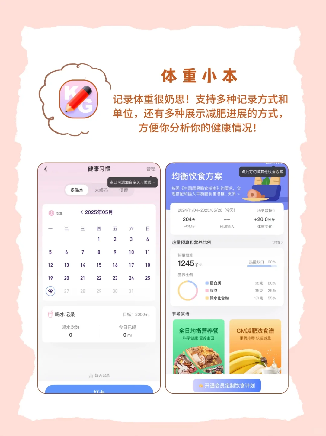 记录体重很奶思!支持多种记录方式和单位,还有多种展示减肥进展的方式,方便你分析你的健康情况!
