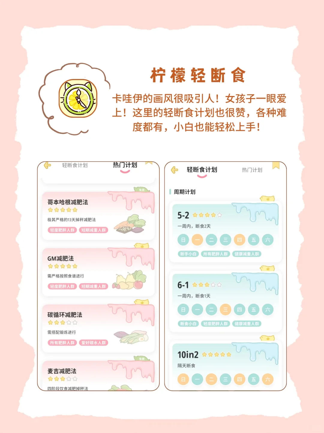 卡哇伊的画风很吸引人!女孩子一眼爱上!这里的轻断食计划也很赞,各种难度都有,小白也能轻松上手!