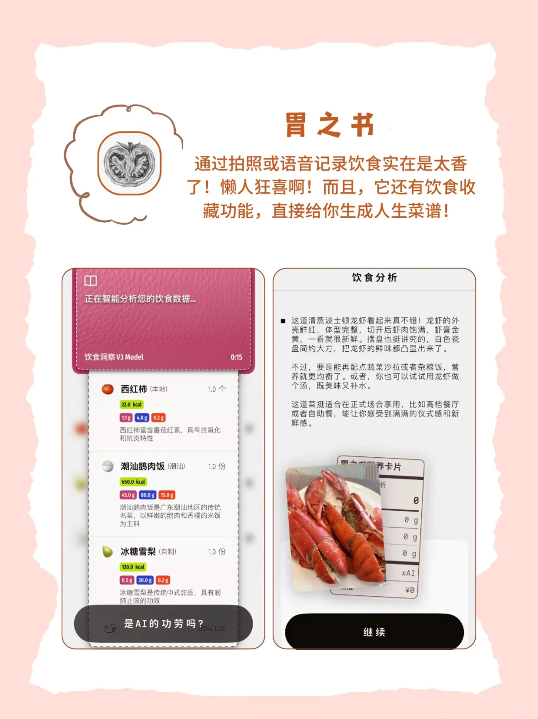 通过拍照或语音记录饮食实在是太香了!懒人狂喜啊!而且,它还有饮食收藏功能,直接给你生成人生菜谱!