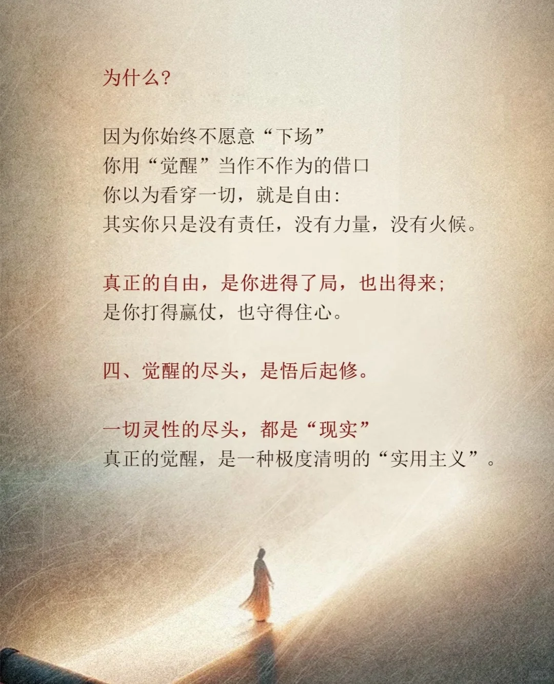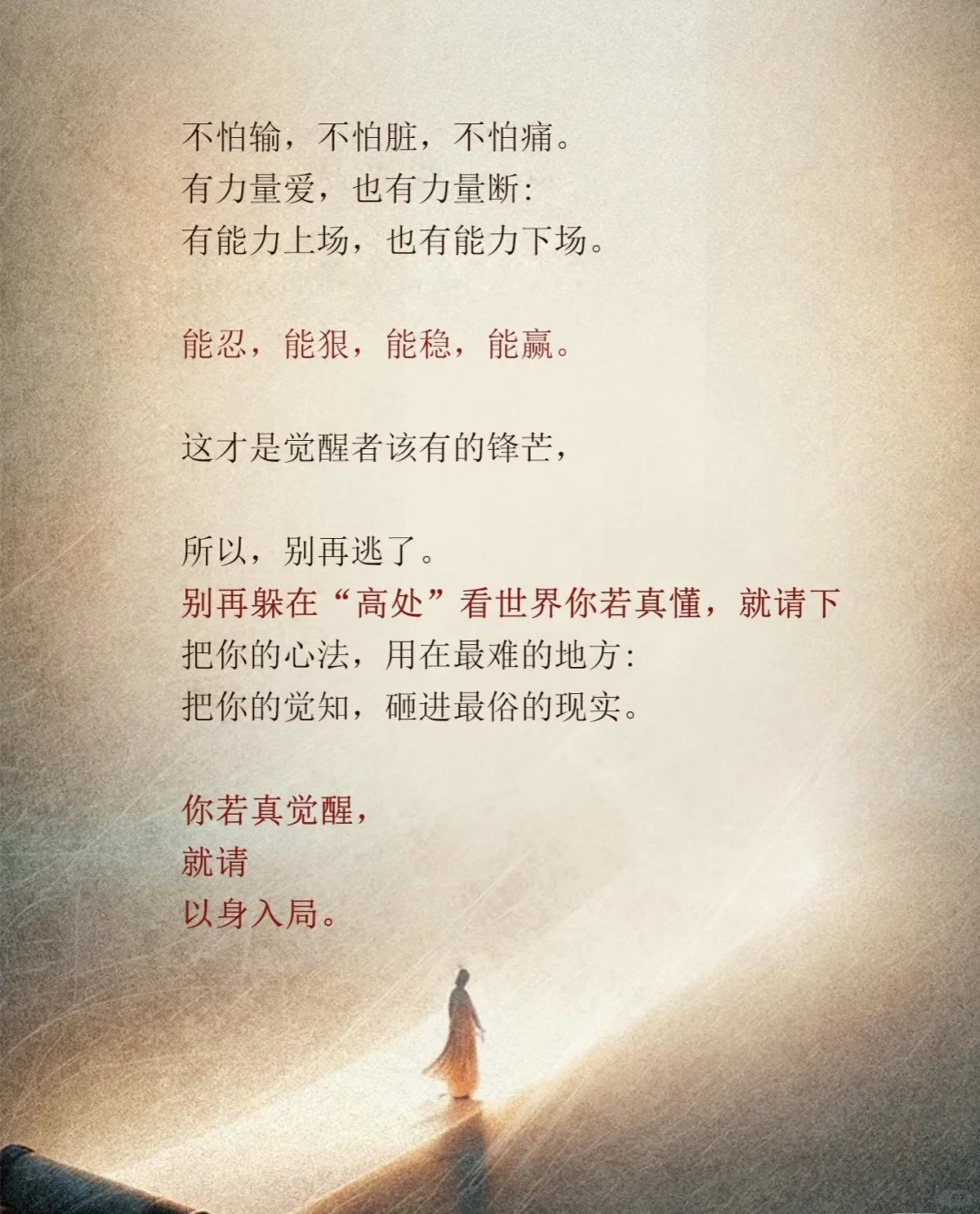 想透人生,却搞不定一段亲密关系: 看懂格局,却赚不到一份体面的收入;满嘴道理,却过不好这一生。 为什么? 因为你始终不愿意“下场” 你用“觉醒”当作不作为的借口,你以为看穿一切,就是自由: 其实你只是没有责任,没有力量,没有火候。 真正的自由,是你进得了局,也出得来; 是你打得赢仗,也守得住心。
