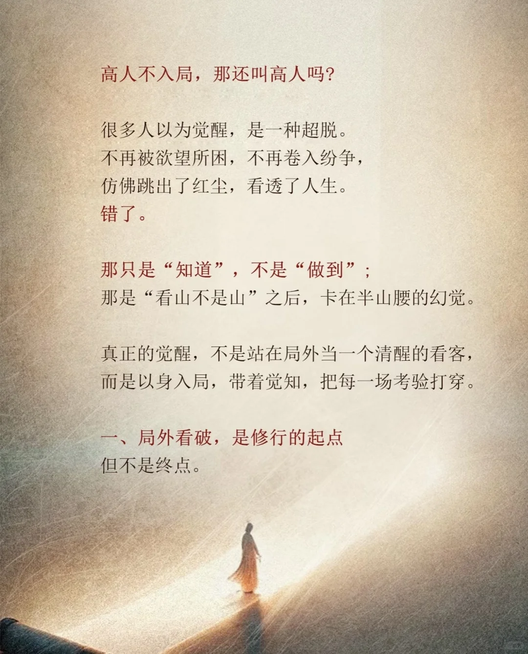 很多人以为觉醒,是一种超脱。 不再被欲望所困,不再卷入纷争, 仿佛跳出了红尘,看透了人生。 错了那只是“知道”,不是“做到”; 那是“看山不是山”之后,卡在半山腰的幻觉。真正的觉醒,不是站在局外当一个清醒的看客, 而是躬身入局,带着觉知,把每一场考验打穿。