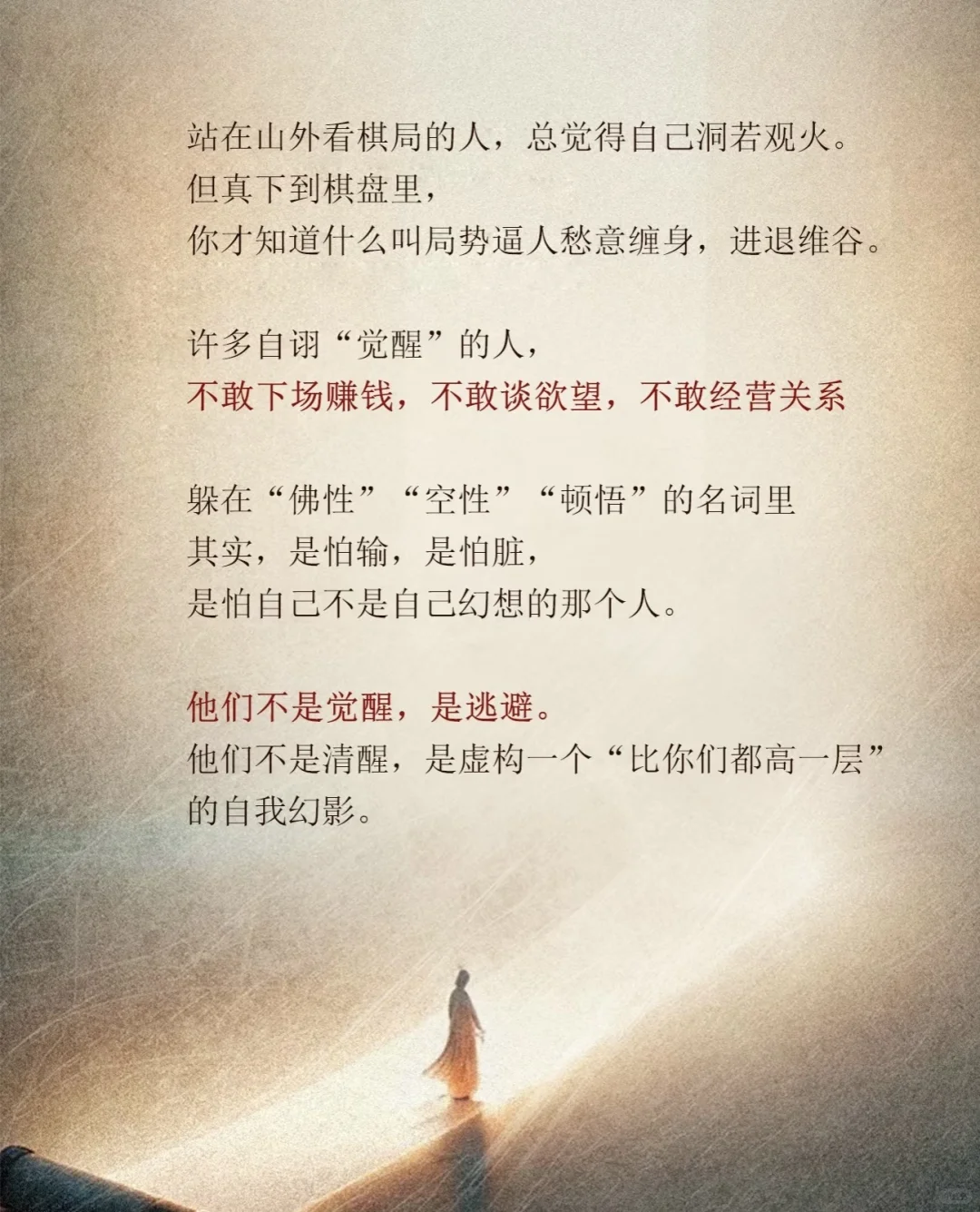 站在山外看棋局的人,总觉得自已洞若观火。 但真下到棋盘里, 你才知道什么叫局势逼人愁意缠身,进退维谷。 许多自翊“觉醒”的人, 不敢下场赚钱,不敢谈欲望,不敢经营关系 躲在“佛性”“空性”“顿悟”的名词里 其实,是怕输,是怕脏, 是怕自己不是自己幻想的那个人。 他们不是觉醒,是逃避。 他们不是清醒,是虚构一个“比你们都高一层” 的自我幻影。