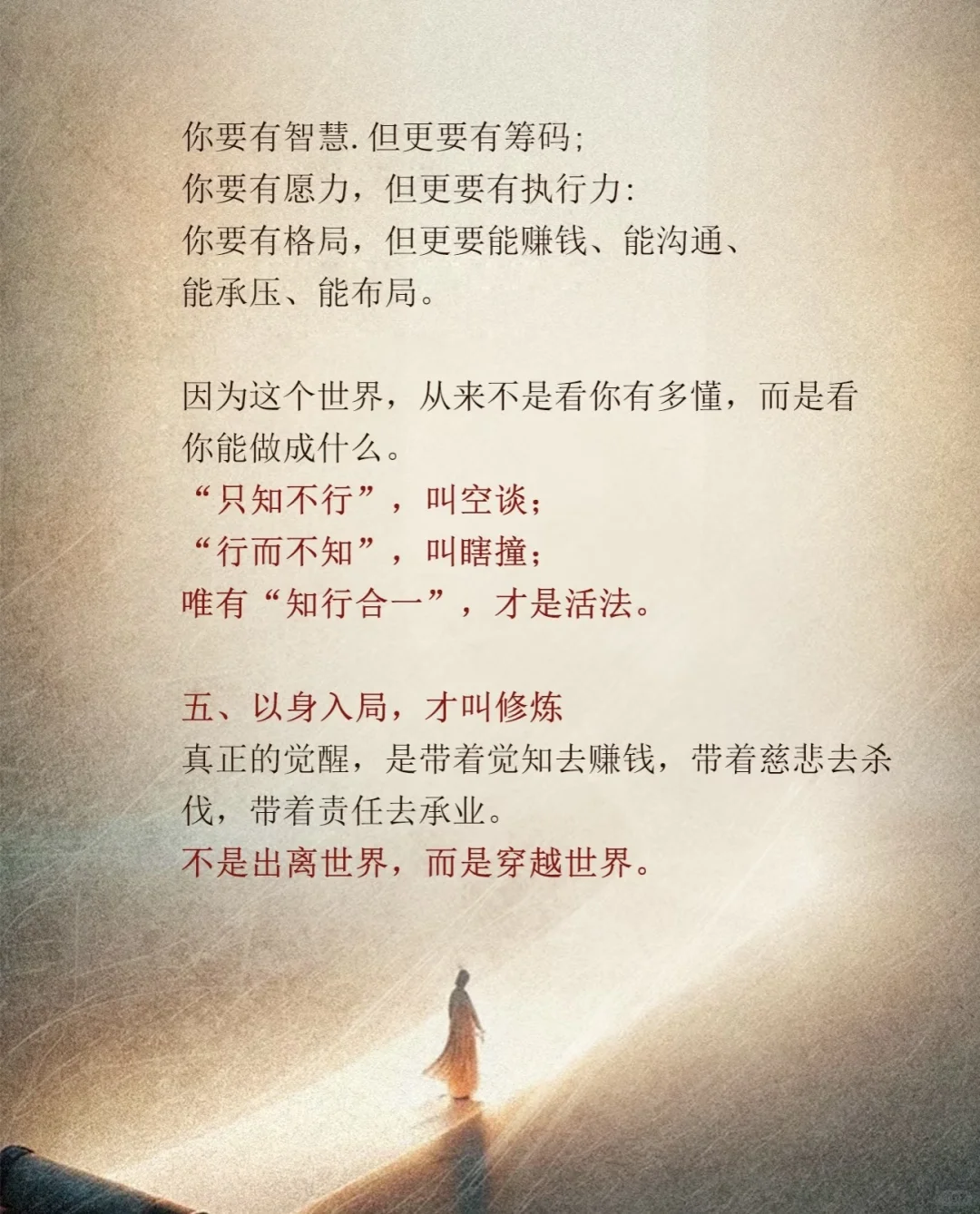 切灵性的尽头,都是“现实” 真正的觉醒,是一种极度清明的“实用主义”。 你要有智慧但更要有筹码; 你要有愿力,但更要有执行力: 你要有格局,但更要能赚钱、能沟通、 能承压、能布局。 因为这个世界,从来不是看你有多懂,而是看 你能做成什么。 “只知不行”,叫空谈; “行而不知”,叫瞎撞; 唯有“知行合一”,才是活法。
