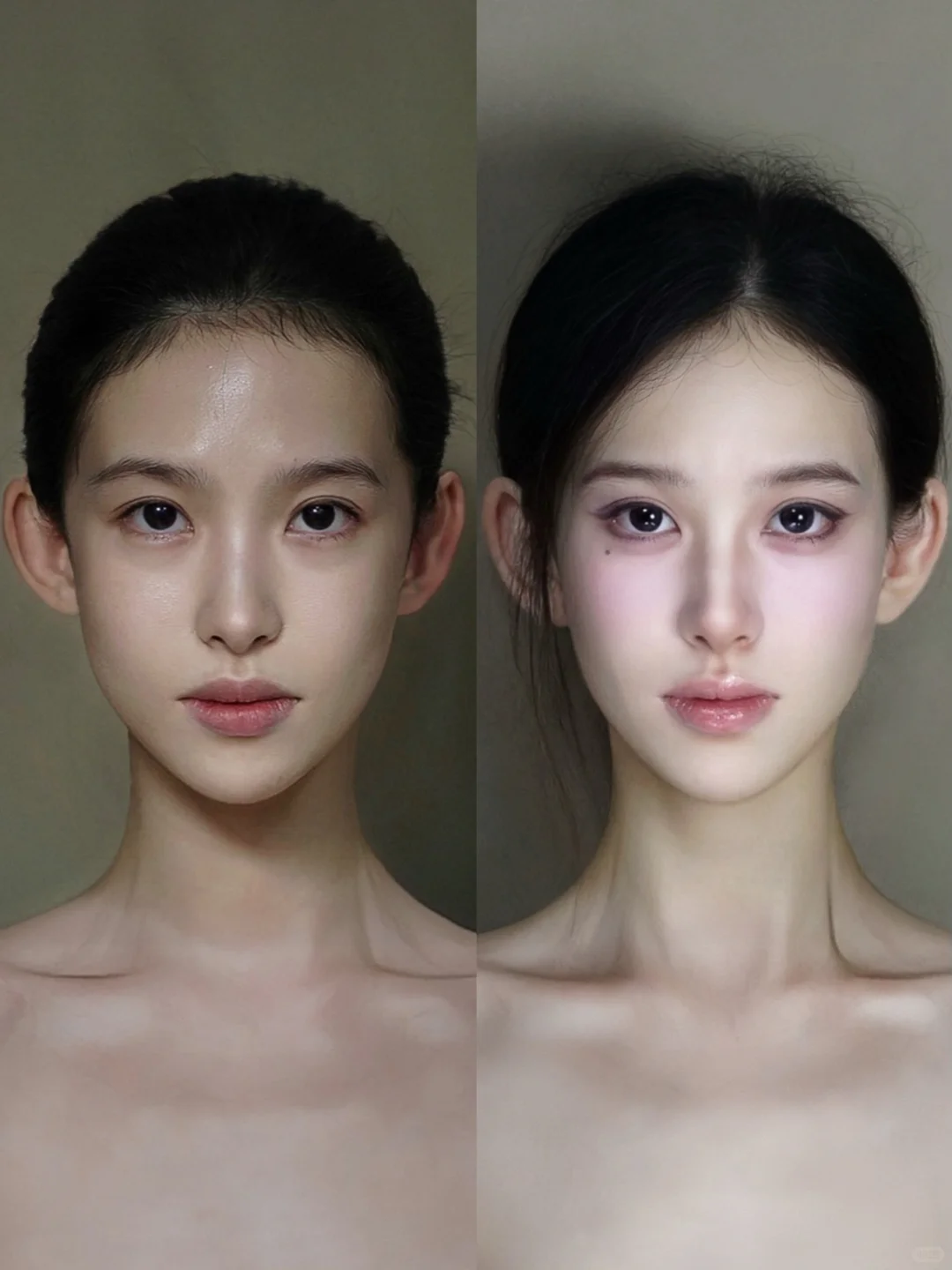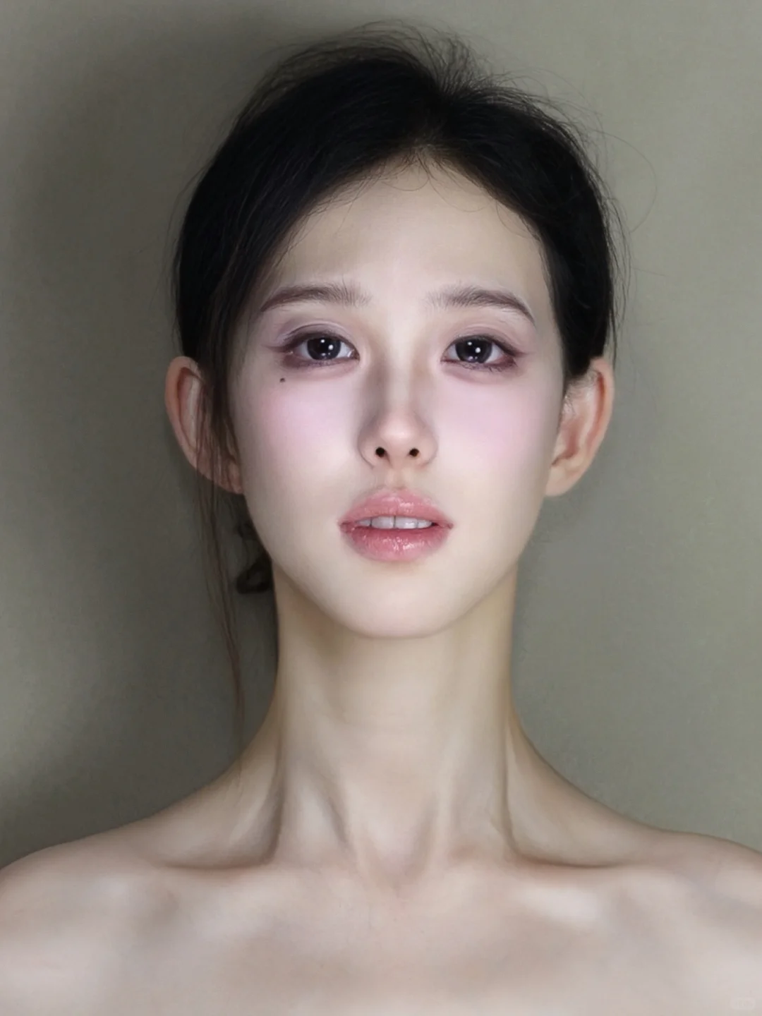 3.腮红:选择低饱和度的灰粉色腮红,从颧骨高点斜扫至太阳穴收窄面部,余粉扫过鼻尖耳垂眼皮增加整体妆容色调一致的氛围感。