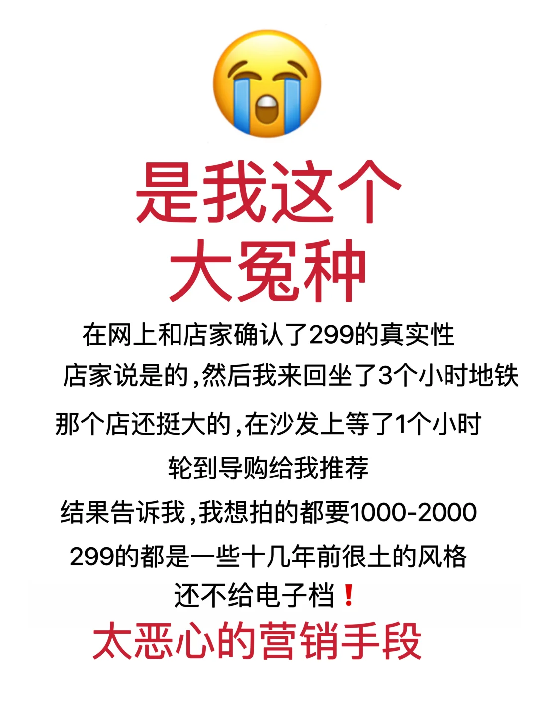 女孩子都很喜欢拍写真,但是又很怕踩坑,我帝一次想拍写真的时候也是遇到恶心营销,被骗去店里说299可以拍2套,后面才发现没有电子档,而且风格也是十几年前很土的那种,在小红薯上也看到一些姐妹发自己踩的坑,299引过去的后面花了3000,不加片就甩脸色服务体验很差,终于在踩坑后谨慎筛选,后面选的几家都还不错。